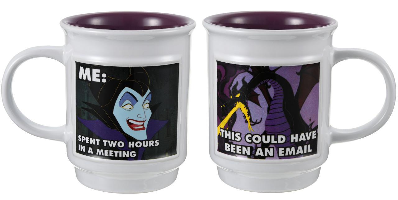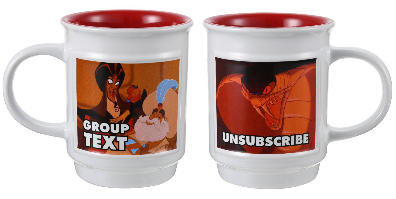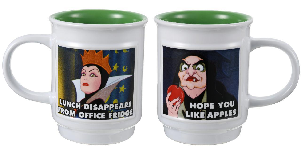 前後に2つのシーンがプリントされて、そこにはユーモラスなメッセージが。また、ディズニーヴィランズのマグカップは、カップの内側はそれぞれのヴィランのイメージに合わせた色にデザインされている。