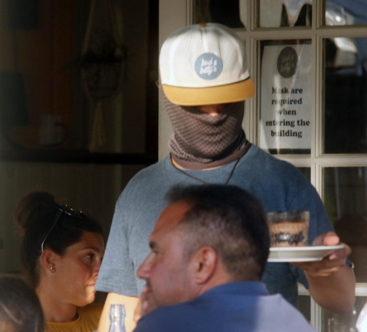 彼の地元であるアメリカのニュージャージー州にあるお店で、チョコレートケーキと見られるデザートを運ぶゲイテン。レストランではゲストはマスクを外すため、そこで働く彼は新型コロナウイルス対策にかなり全力。マスクではなく布を顔に巻き、目の周りだけを空けたゲイテンの姿が確認できる。