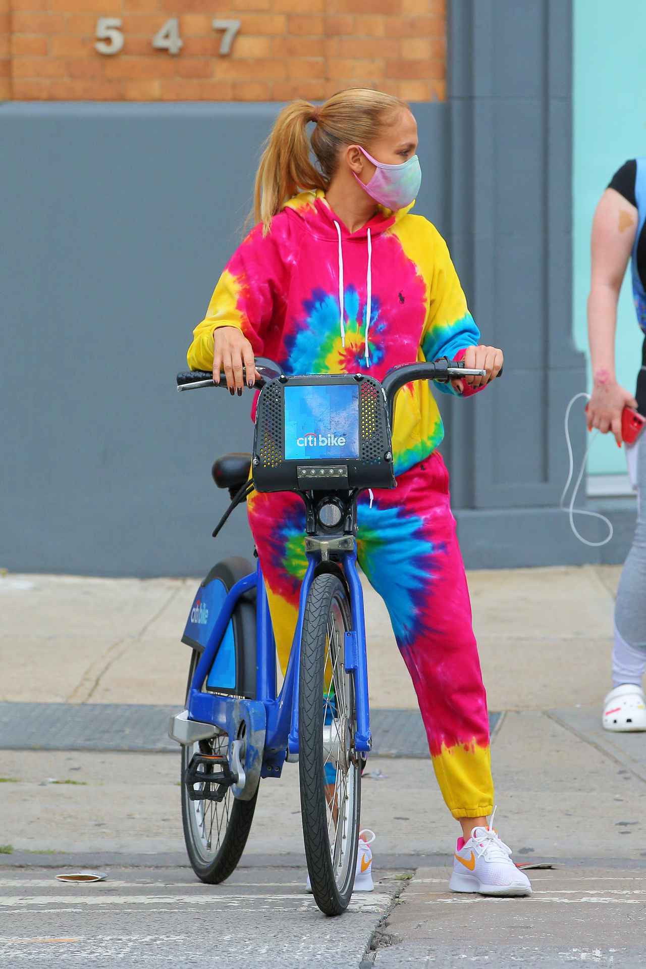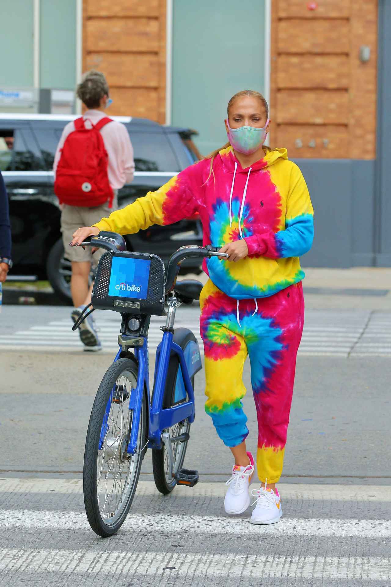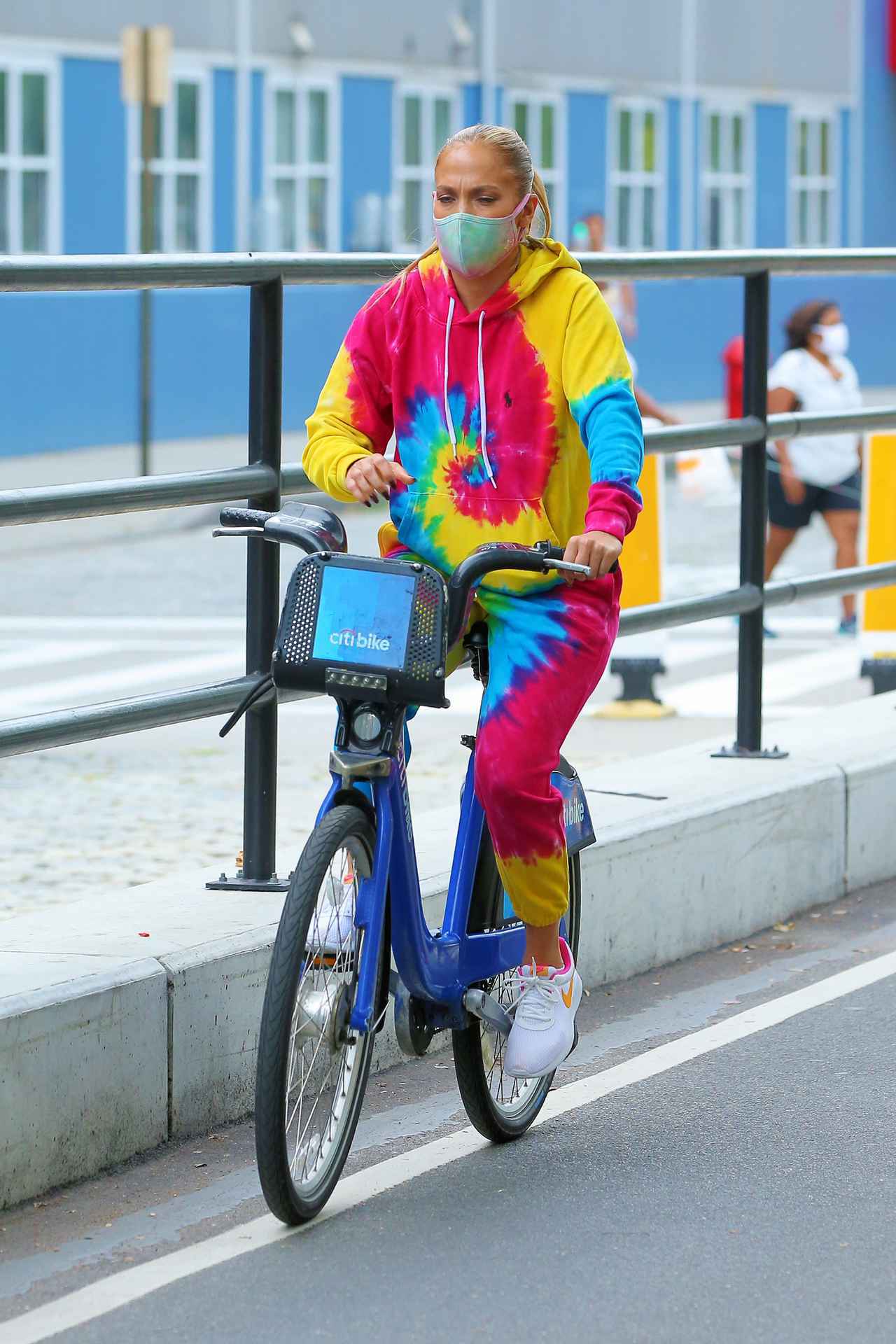 タイダイのスウェットにタイダイのマスクを合わせたお目立ち度100%のド派手な服装で自転車を押すジェニファー。
