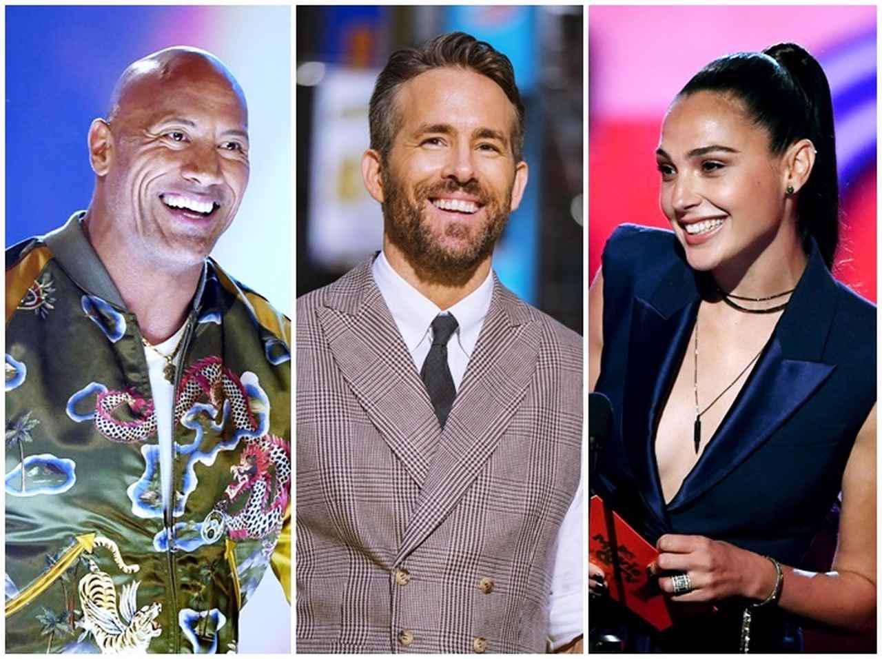 『Red Notice』で共演するドウェイン、ライアン、ガル。同作は、最重要指名手配者の美術品泥棒とその存在を追う捜査官の攻防を描くスリラー映画で、ドウェインはインターポール(国際刑事警察機構)の捜査官を演じる。