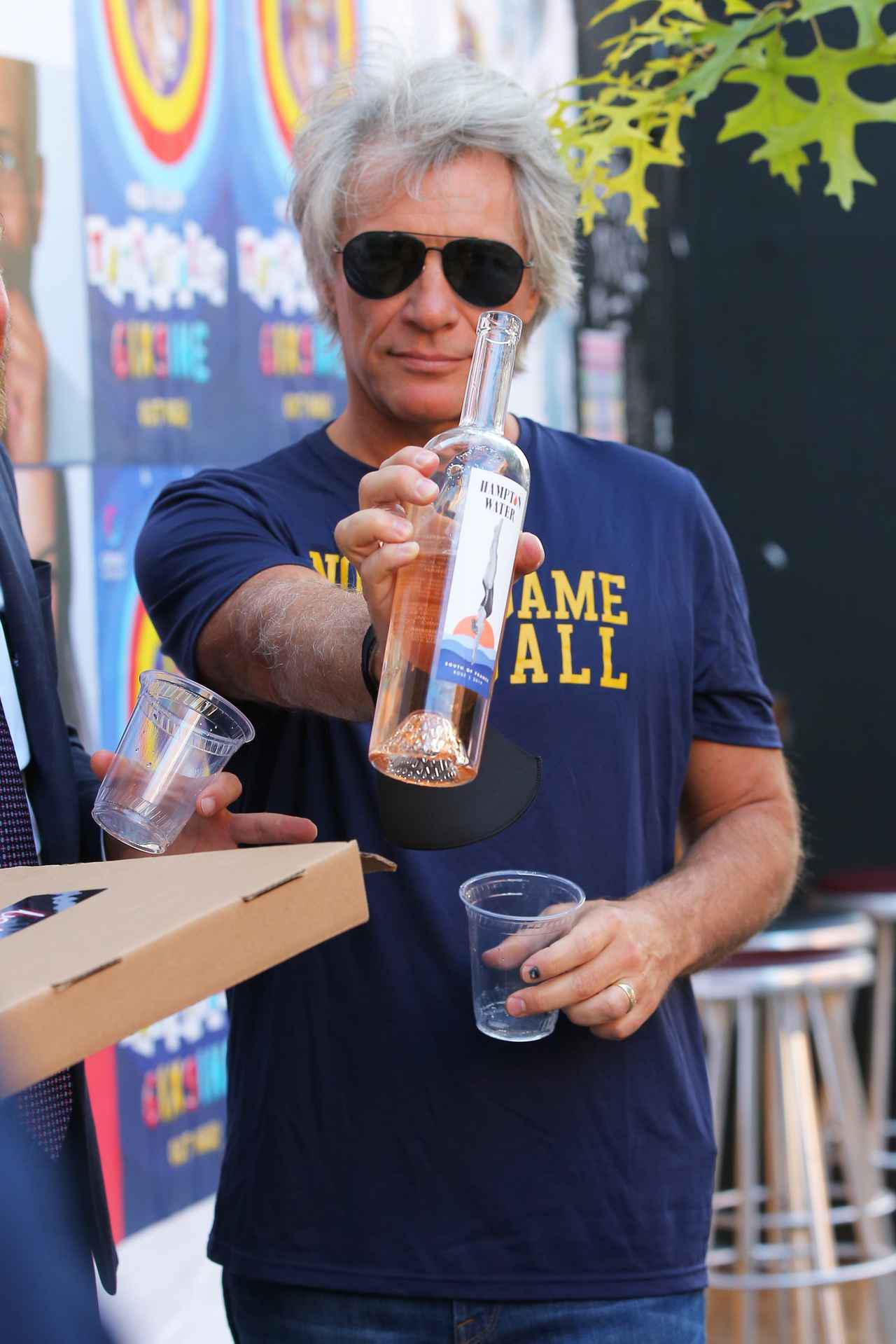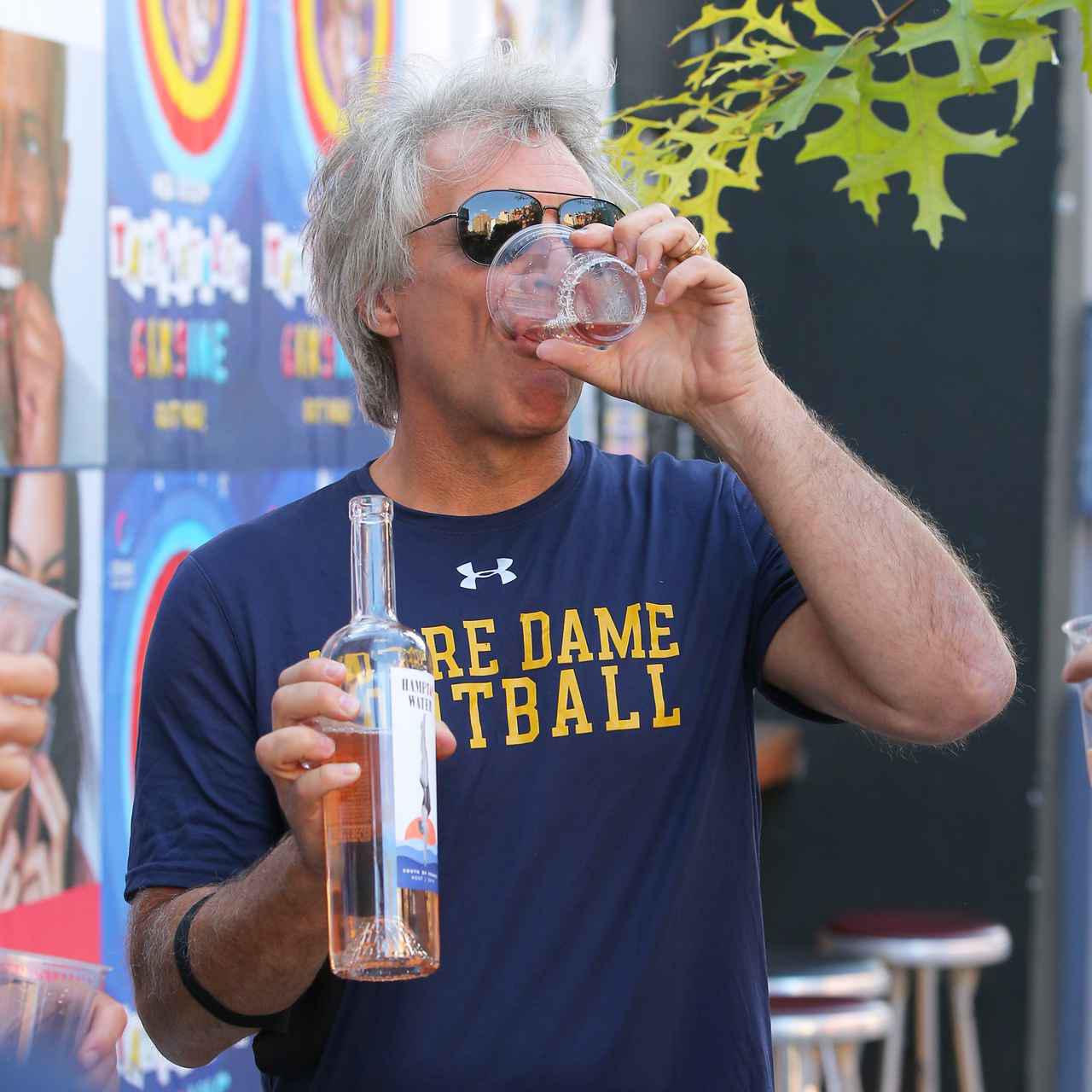 立ちながら何枚かピザを食べていたジョンだけれど、さすがに喉が渇いたようで、取り出したのは、なんと自身と息子のジェシー・ボン・ジョヴィ、そしてフランスのワインメーカー、ジェラール・ベルトランが手がけるロゼワインのブランド、ダイビング・イントゥ・ハンプトン・ウォーター。突然宣伝モードに入ったジョンは、パパラッチに向けてボトルをアピール。