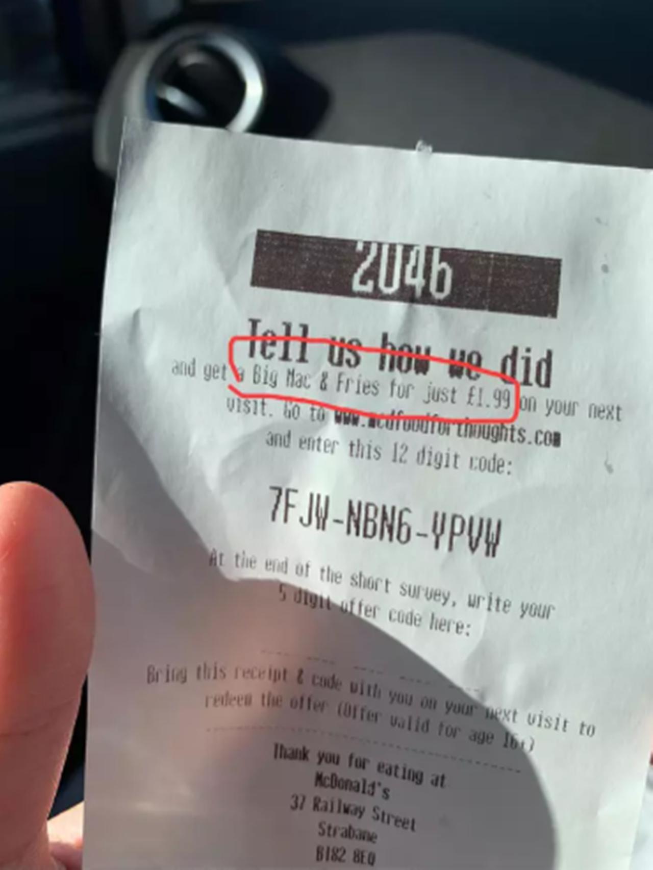 1人のユーザーが投稿した写真のレシートには、「私たちがどうだったか教えてください」と大きく書かれているのが目立つけれど、その文字の下をよく読んでみると、「そして次回のために、ビッグマック&(ポテト)フライを1.99ポンドでゲットして」と書かれている。ユーザーは、こうコメントしている。