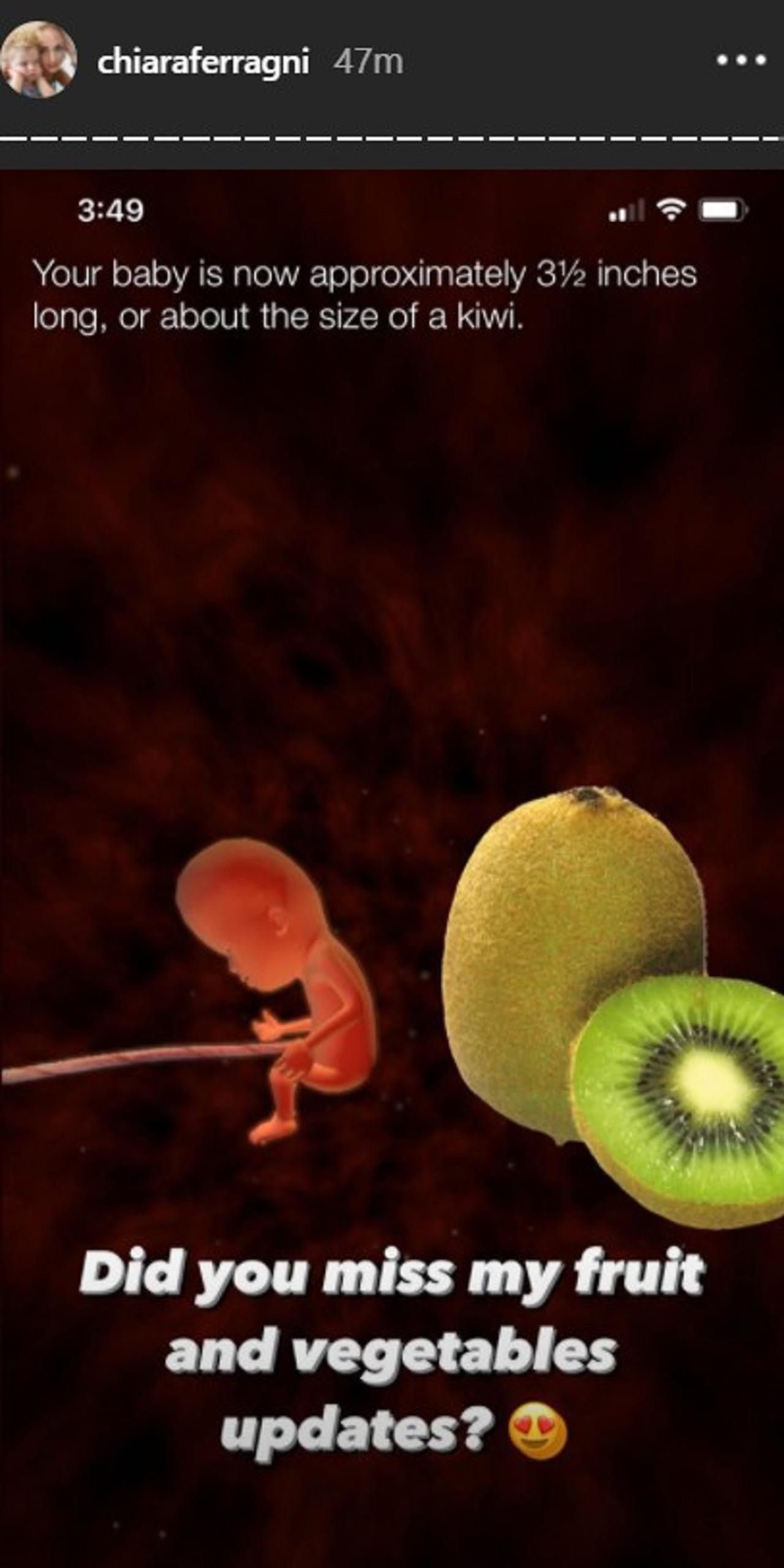第2子の妊娠中も頻繁に胎児の成長ぶりをお知らせするつもりのようで、「フルーツ&野菜に例えるアップデートが恋しかったでしょ?」というお茶目なコメントともに、「あなたの赤ちゃんの現在のサイズは、全長およそ3インチ半(約8.9センチ)。キウイくらいの大きさです」と記されたアプリの画面をインスタグラムストーリーで公開していた。