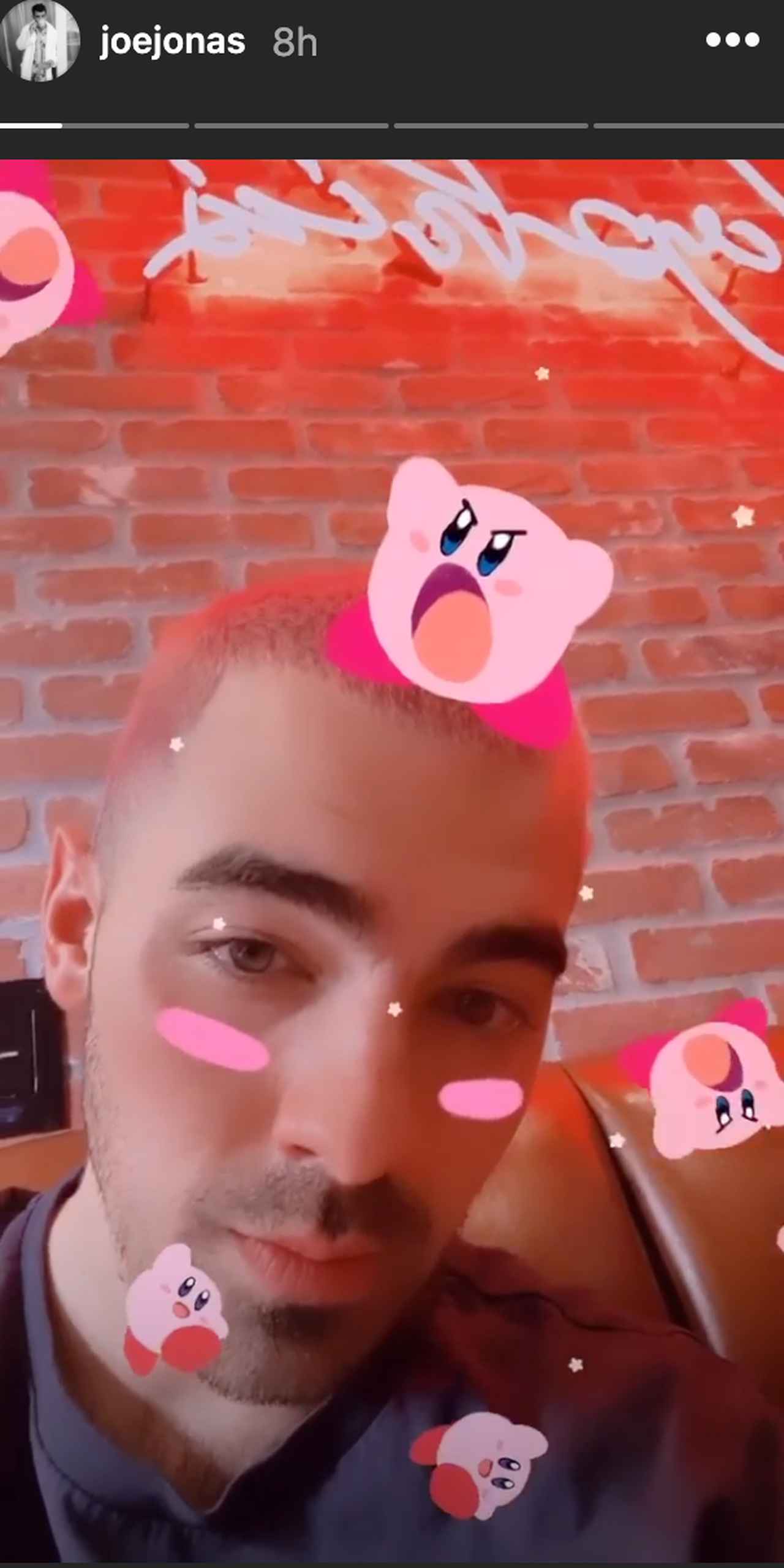 ピンクヘアーのジョーはなかなか見慣れないけれど、本人はこの髪型をとても気に入っているよう。ジョーは、日本のゲームソフト『星のカービィ』に登場するピンクカラーでお馴染みのキャラクター、カービィのフィルターで加工した動画をインスタグラムのストーリーに投稿。ピンク同士の“共演”を楽しんだ。