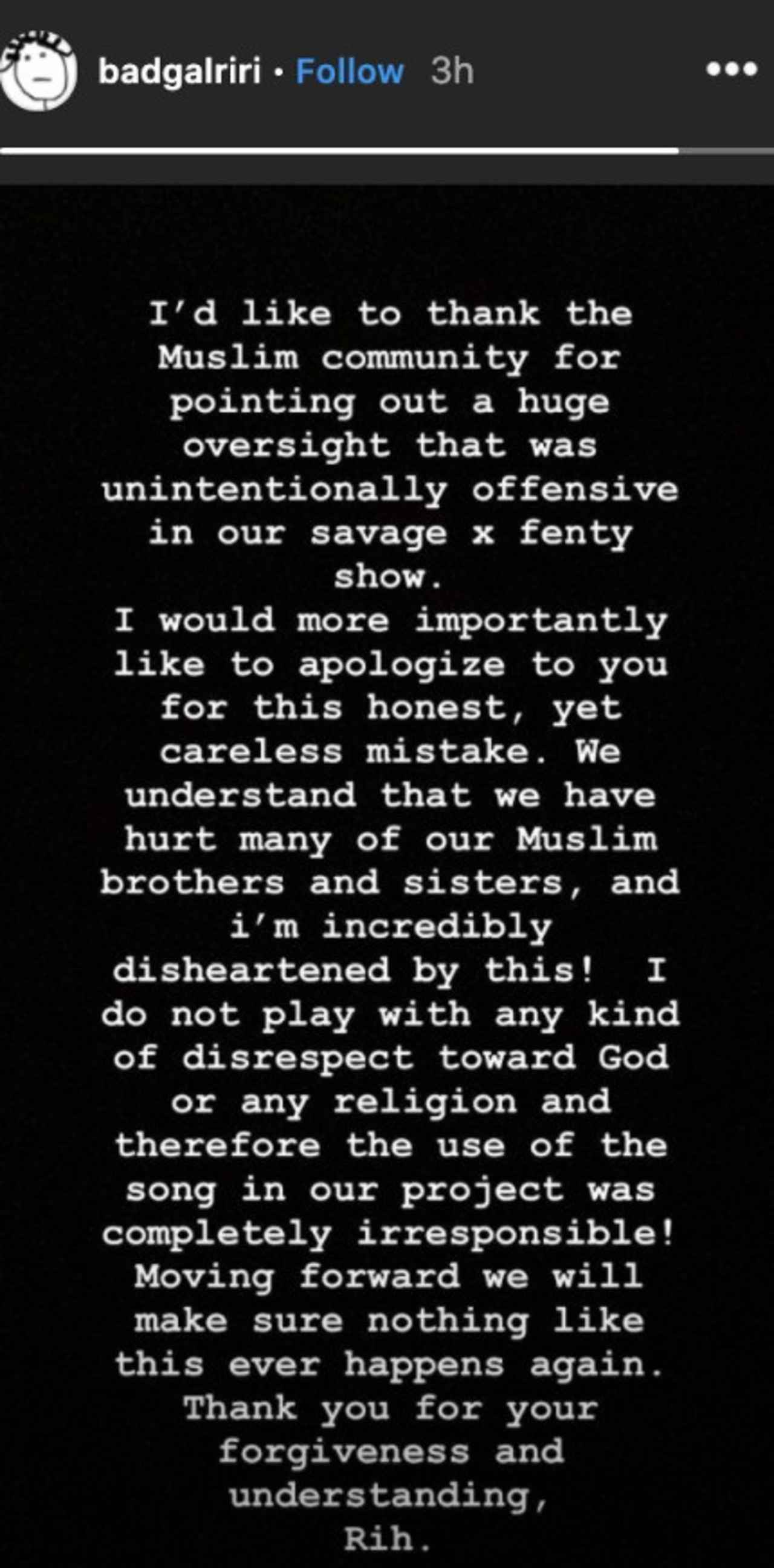 「サヴェ―ジ×フェンティのファッションショーにおける、意図的ではなかったものの、不快で重大なミスを指摘してくださったイスラム教コミュニティに感謝します。そして、何より、今回の不注意な誤りに関して謝罪します。私たちは、イスラム教の多くのブラザーやシスターを傷つけてしまったことを理解しており、私は、この件に関して、非常に心を痛めています。神に対しても、いかなる宗教に対しても不敬をはたらくつもりはありません。プロジェクトにあの楽曲を使用したことは完全に無責任でした。今後は、同様の事が起きないように努めます。ご容赦とご理解に感謝します」
