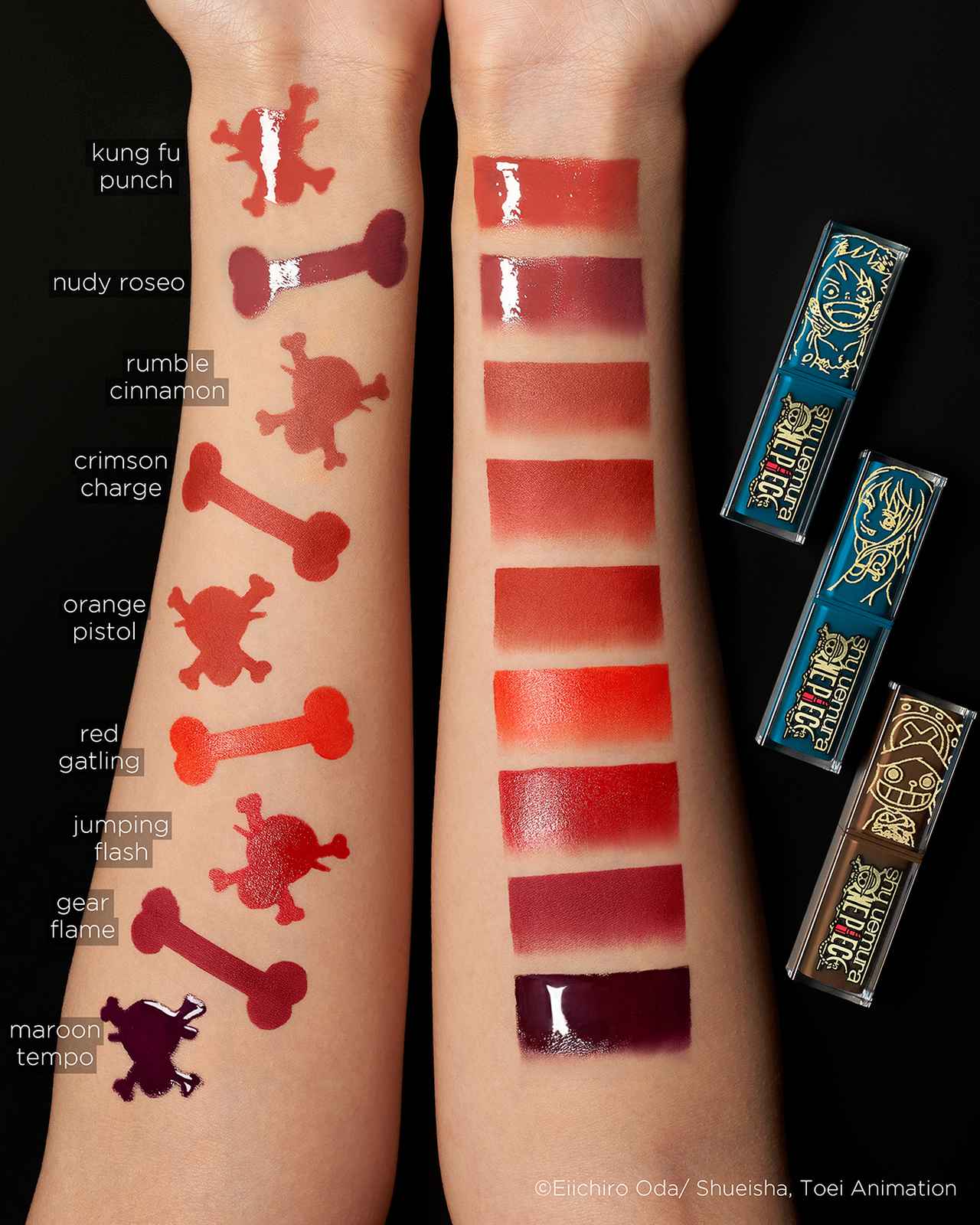 麦わら一味の攻撃技を、シュウ ウエムラの「ルージュ アンリミテッド」で表現した限定リップ。ツヤ感のあるタイプからマットタイプまで全9色の幅広いカラーレンジがラインナップ。