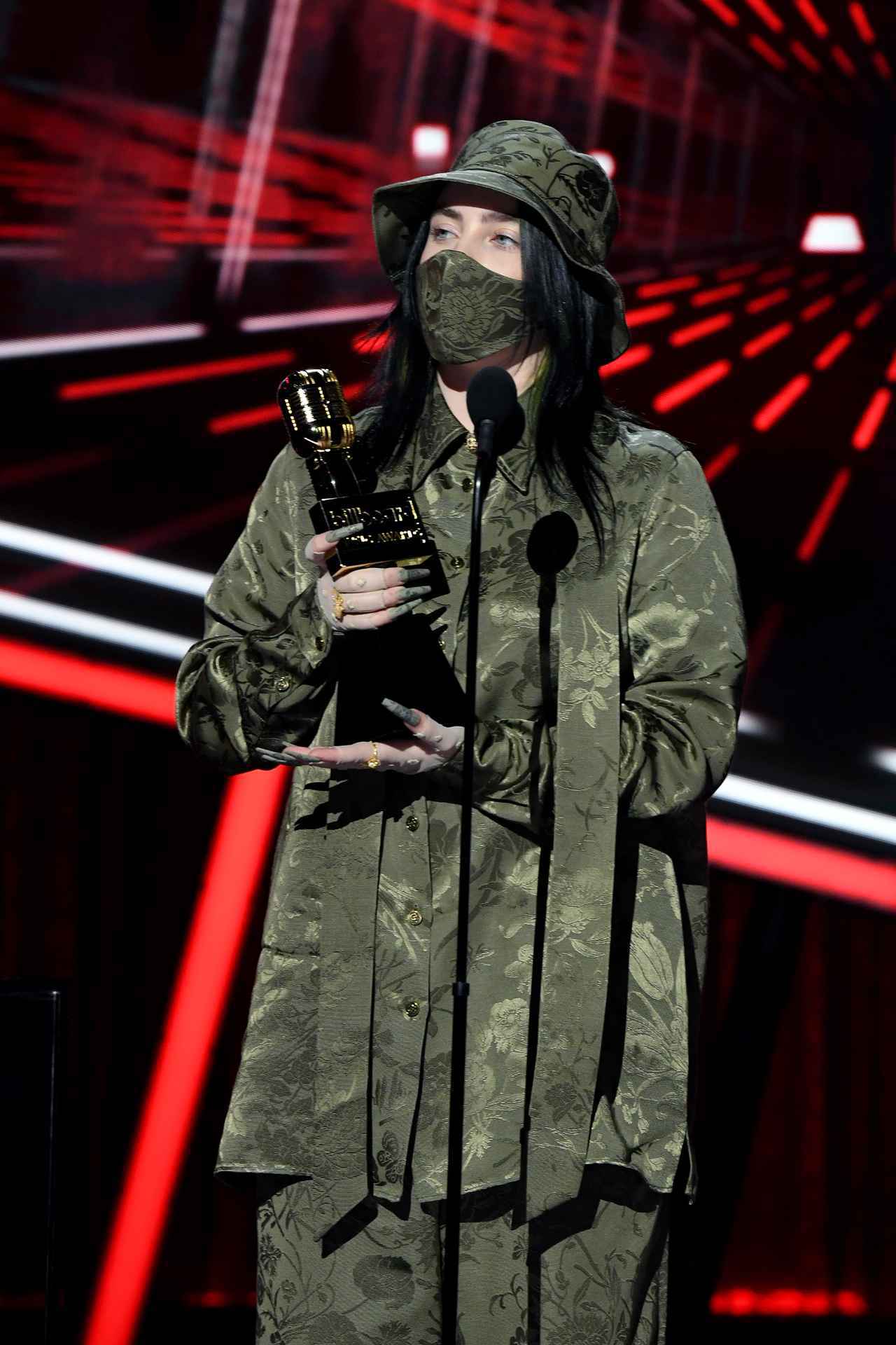 そんなビリーが、受賞スピーチをするたびにずっと身につけていたものがある。それは、新型コロナウイルスの感染拡大を予防するために推奨されているマスク。マスクをつけていると表情がわかりづらく、声がこもりスピーチが聞き取りにくいため、多くのアーティストがマスクを外していたけれど、ビリーはそんなことはお構いなくグッチ(Gucci)のセットアップにマッチさせたマスクをつけ続けた。