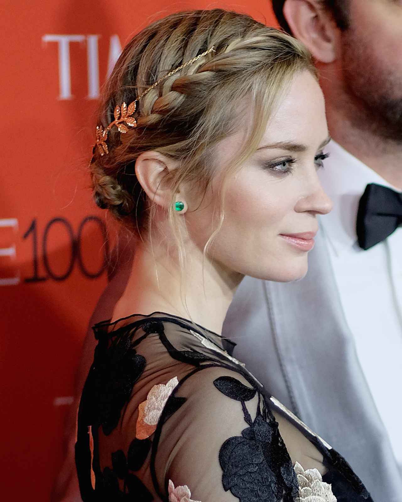 女優のエミリー・ブラントは、まるで王冠のように編み込んだアップスタイルに、リーフの形をしたヘアアクセサリーをつけて上品で華やかな印象に。