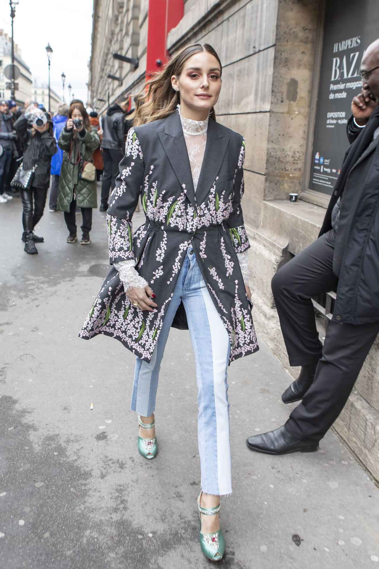 デザイナーとしても活躍する人気ファッショニスタのオリヴィア・パレルモは、美しいフラワープリントが描かれたジャケットにパッチワークのデニムを合わせたモードな着こなし。足元はビジューのパンプスでリッチに。