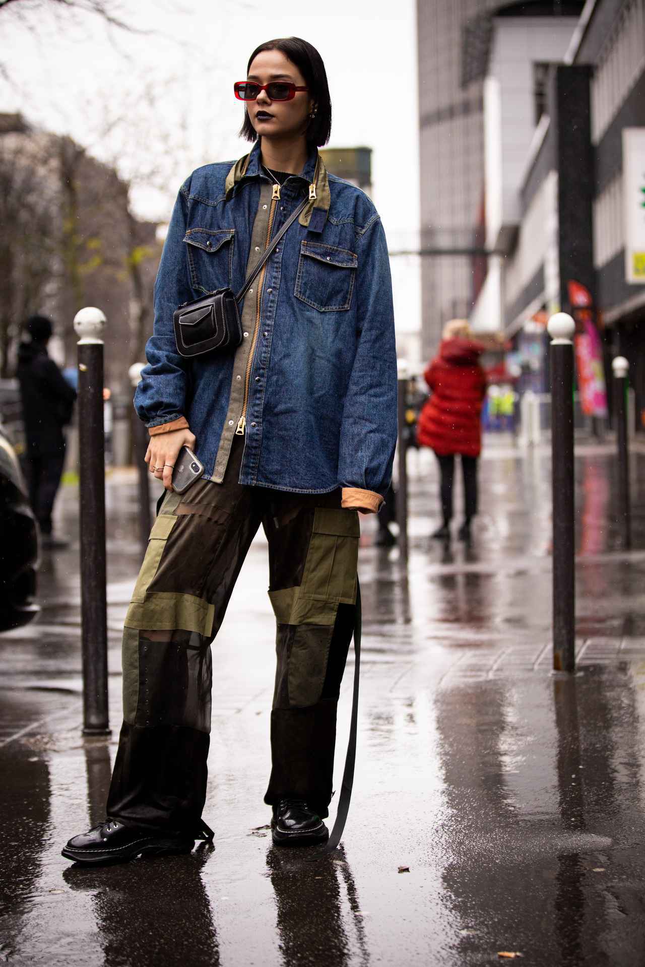 ファッションにも定評があるシンガーのアンナ・クプリエンコは、デニムジャケットにミリタリー調のパッチワークのパンツを合わせたメンズライクな着こなしがクール。足元はゴツめのブーツに、ショルダーバッグはフロントにかけた旬な着こなしで。