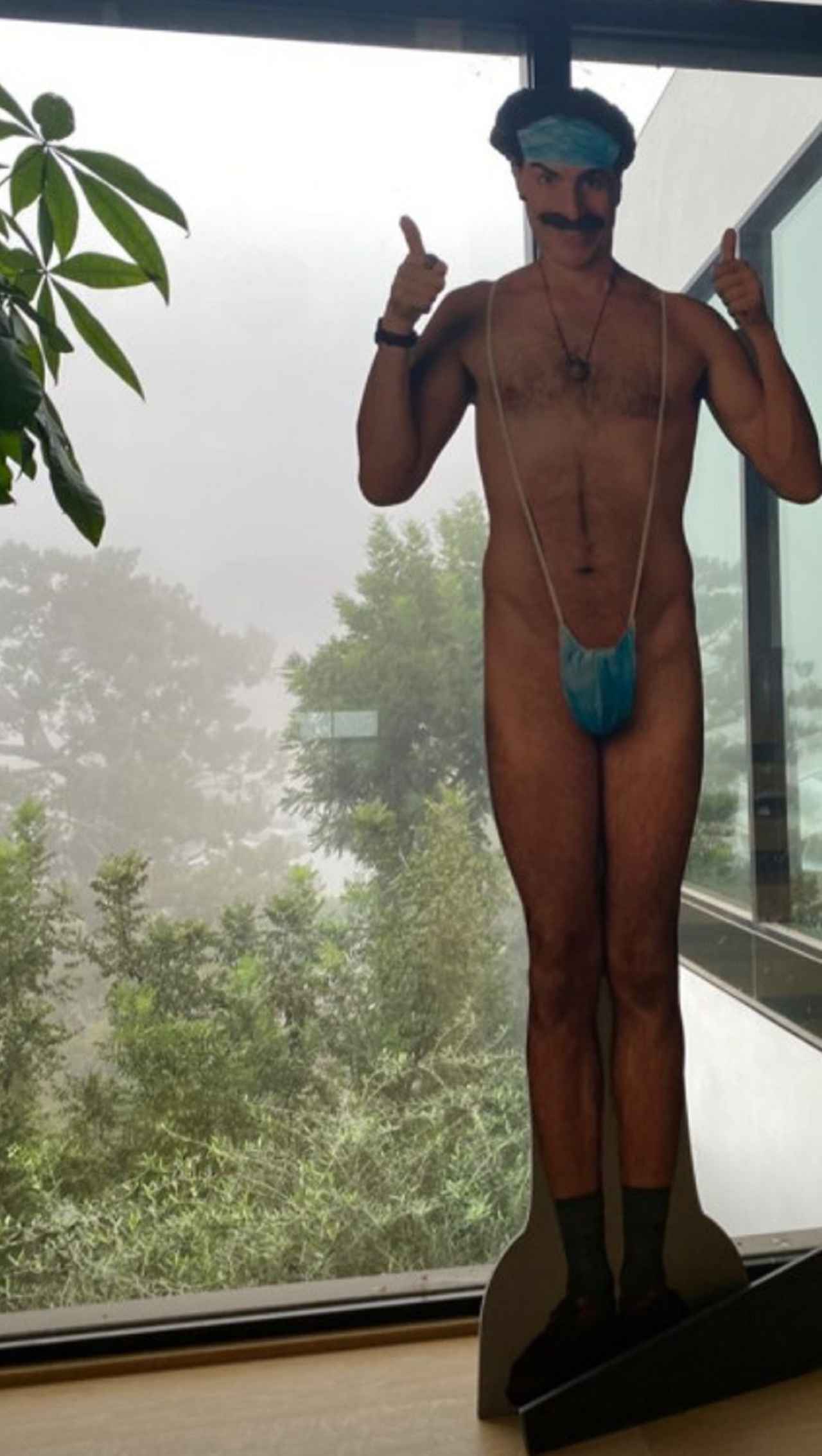 ご覧の通り、ゲストたちはサシャ扮する架空のカザフスタン人ジャーナリスト、ボラット・サグディエフが、股間と額をマスクで隠しただけの、ほぼ裸の等身大パネルを囲んでポーズ。