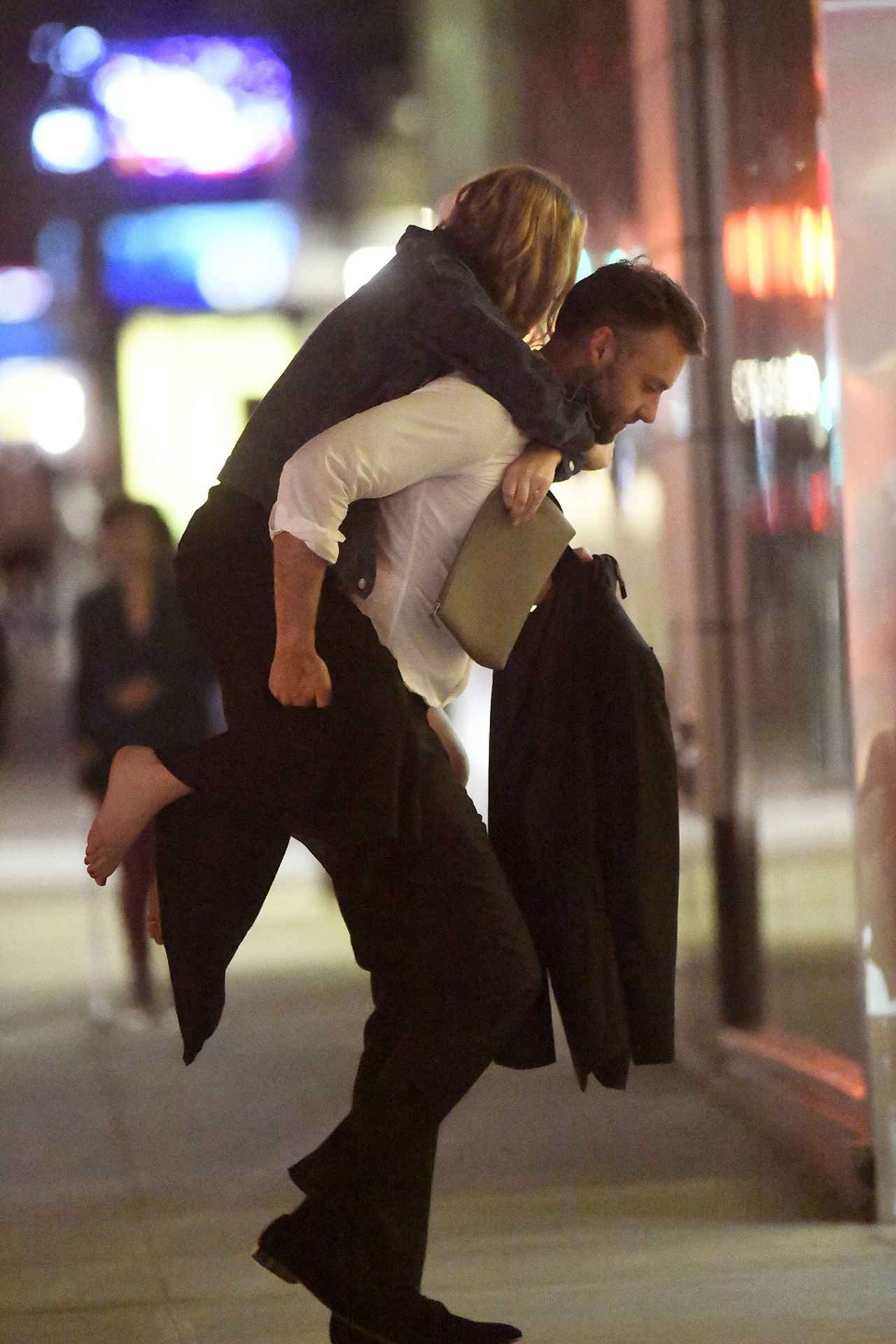 ディナーに出かけたレストランからなぜか裸足のジェニファーをおんぶして帰るクック。(2019年撮影)