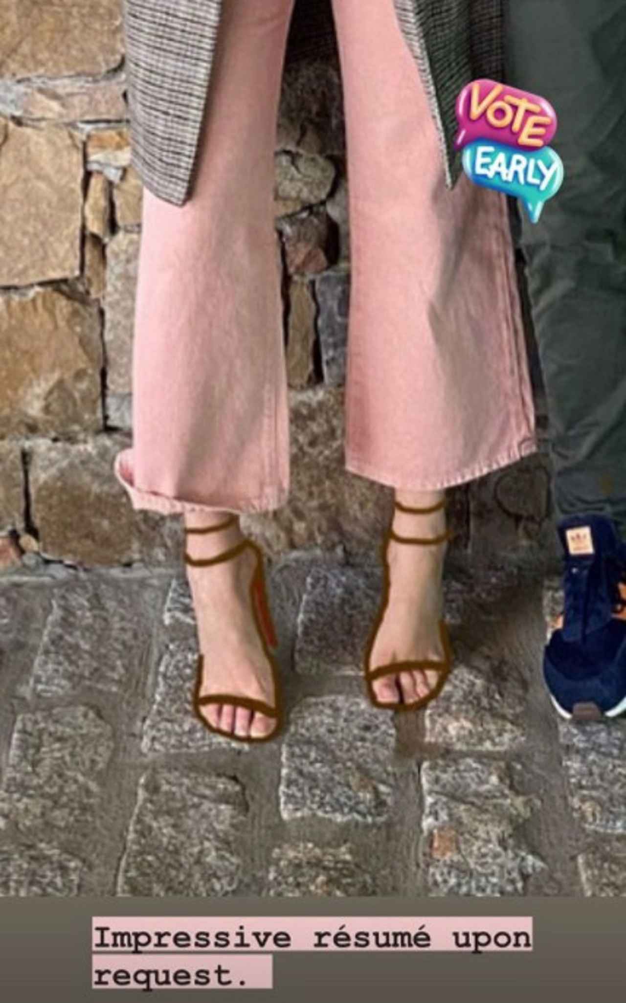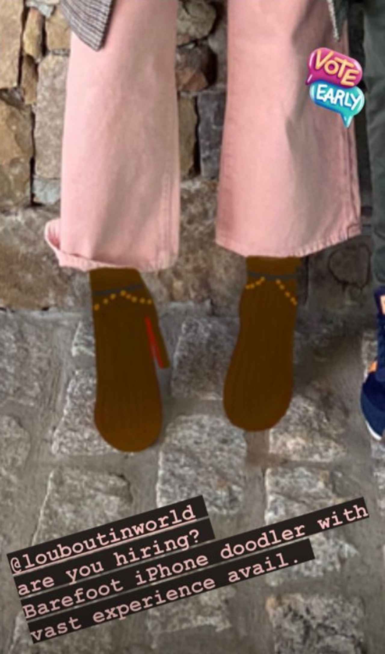 ブレイクは、投稿からしばらくして、インスタグラムストーリーで種明かし。裸足の足元に書き足されたストラップシューズのアップと、さらにもう一パターン、ブーツバージョンもあったことを紹介した。