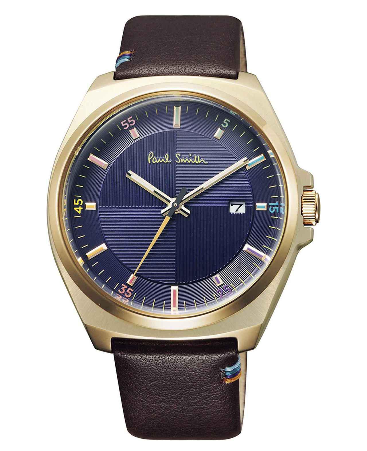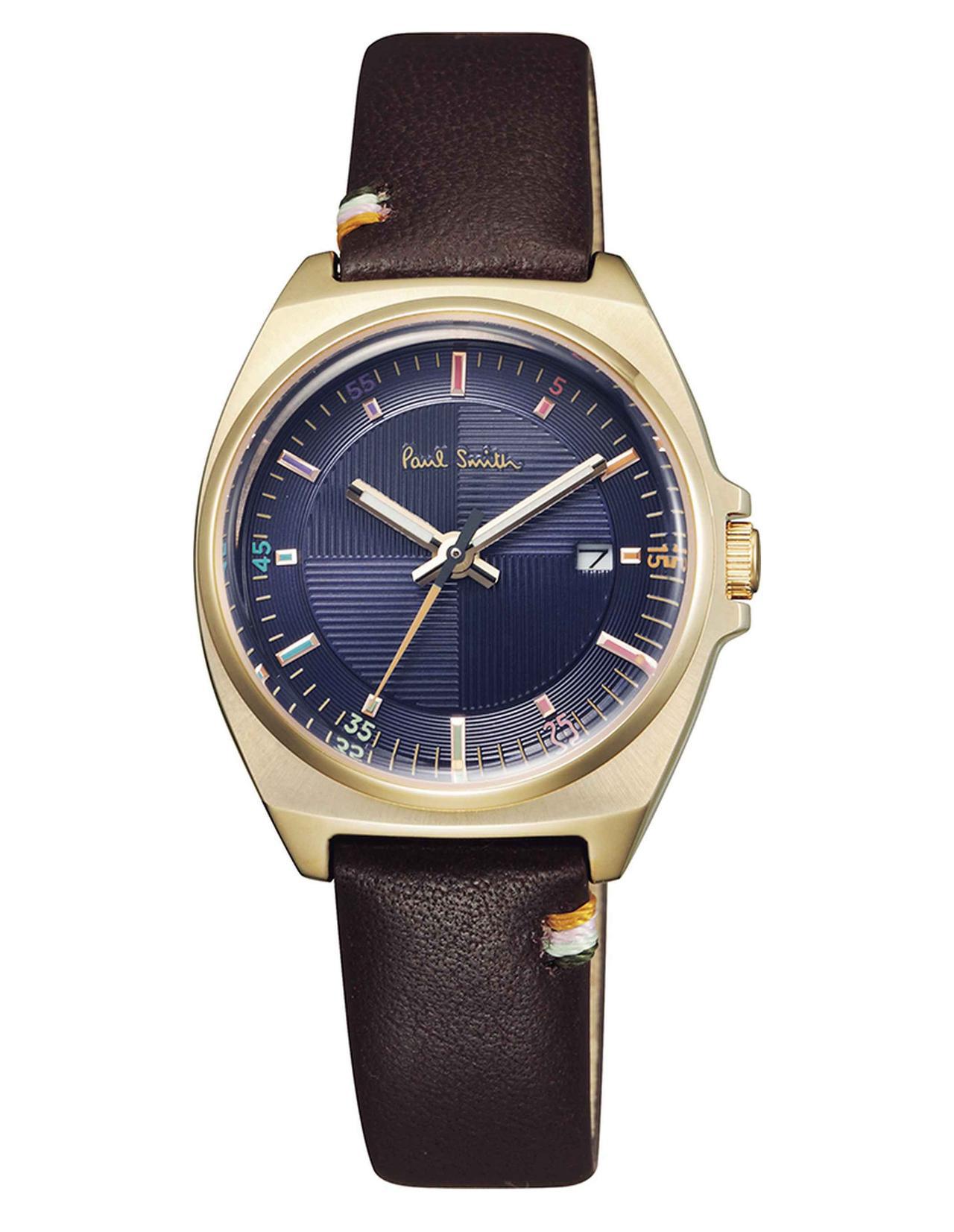 ケースには人気の高いウォームゴールドのクッションシェイプを採用し、ストラップは柔らかく上質なブラウンのカーフを採用。高級感のある洗練された趣に仕上げた。またストラップのステッチやループにも、インデックス同様にアクセントカラーが用いられ、ポール・スミスらしさが楽しめるデザインになっている。