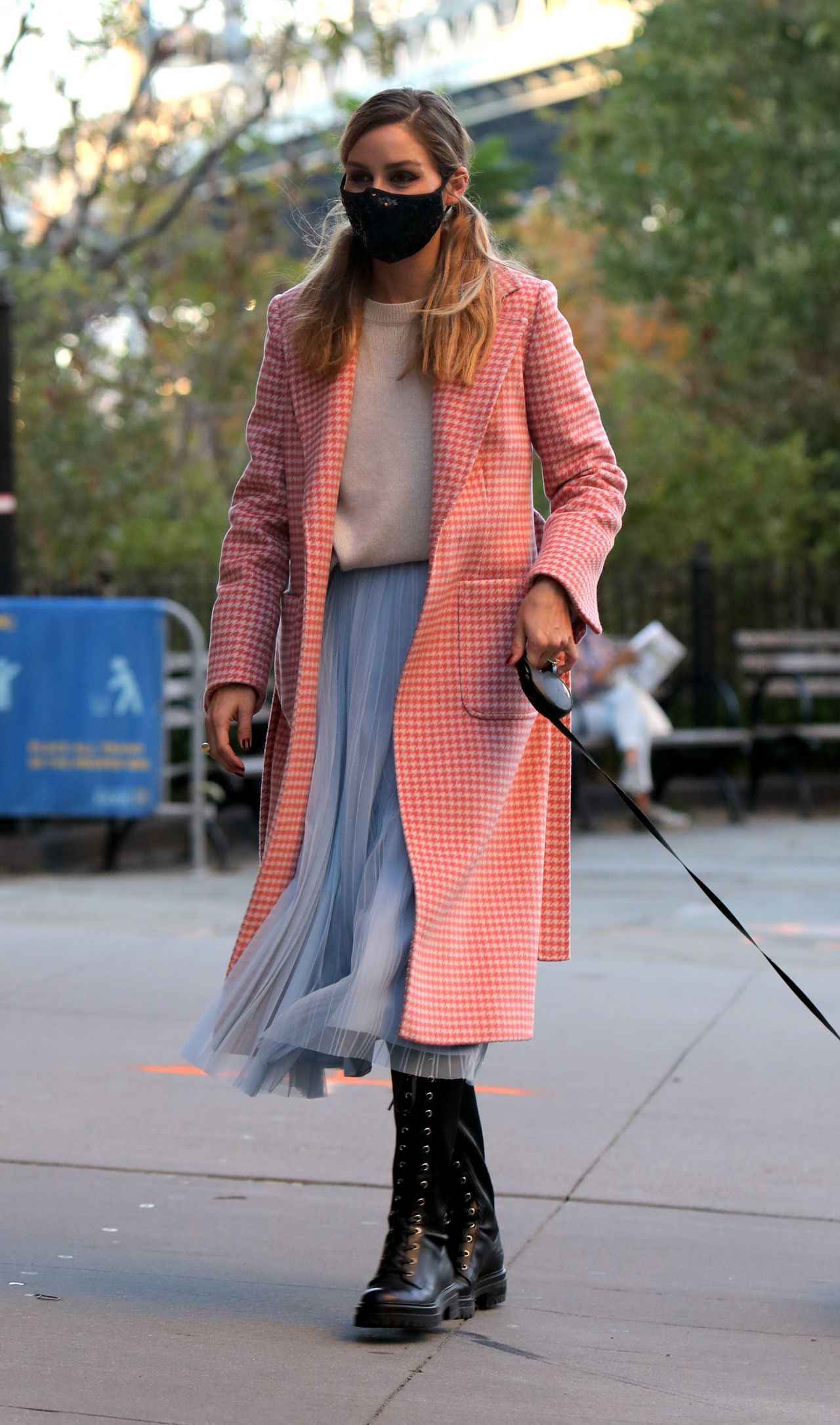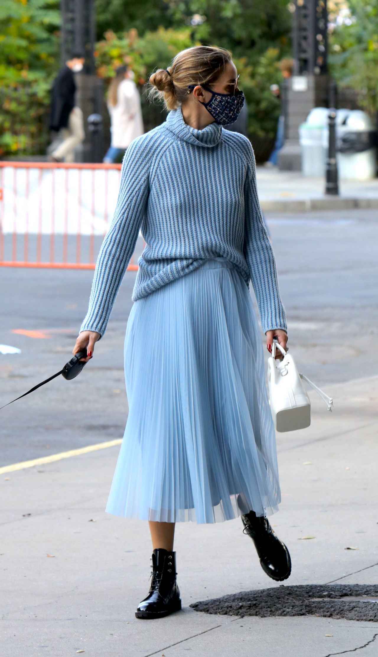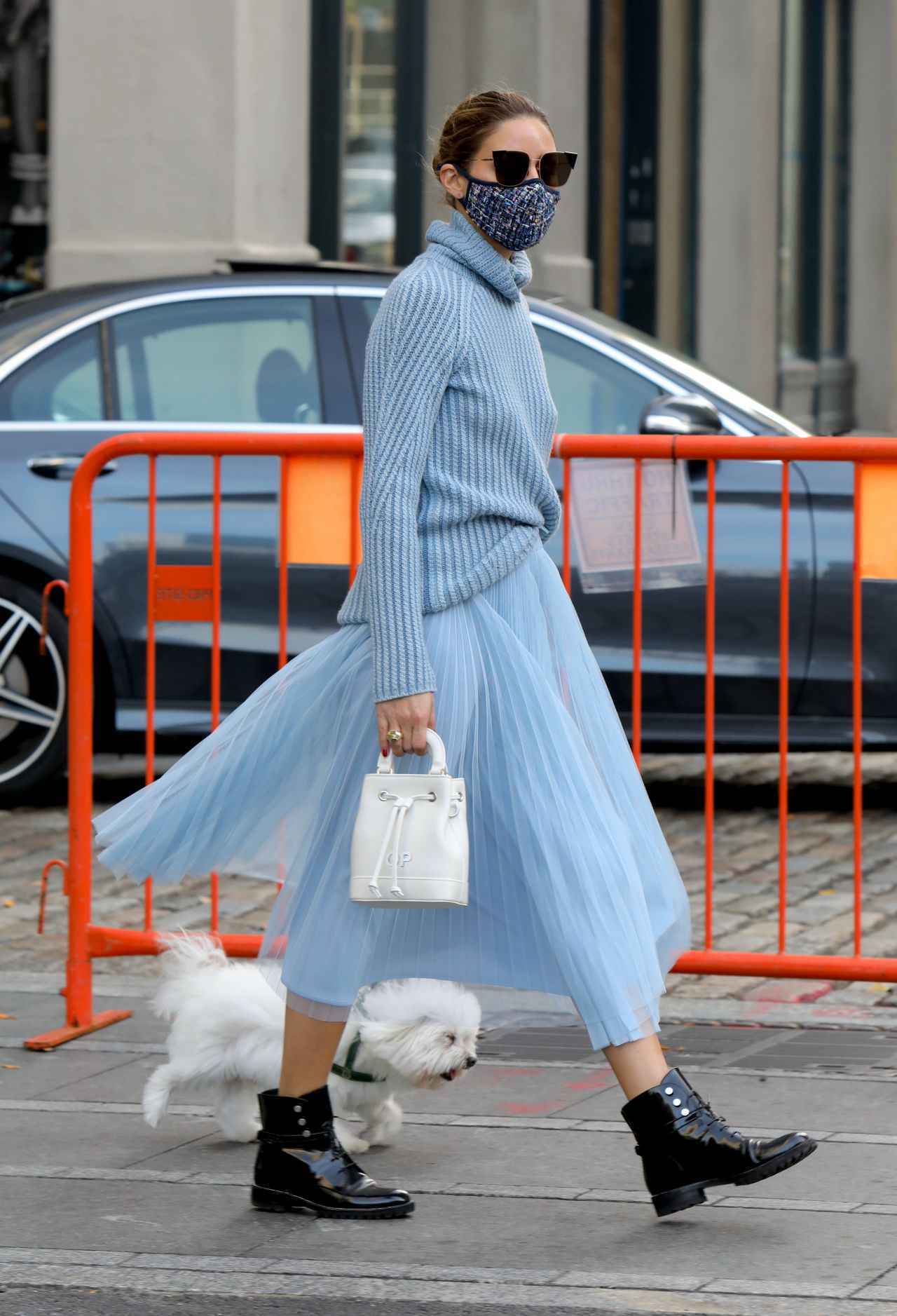 ニューヨークで愛犬の散歩中のオリヴィア・パレルモは、ペールブルーのプリーツスカートに、同系色のざっくりニットを合わせたワントーンコーデ。ブルーと相性のよい白のミニバッグで、冬らしいカラーリングがエレガント。足元は今季も注目のレースアップブーツで外して。