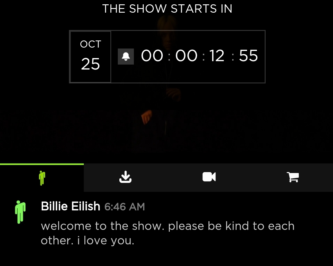 今回のオンラインライブは、日本時間10月25日の午前7時からスタートし、始まる前にはビリーが、代名詞ともいえるダボダボの服を1枚ずつ脱ぎ、最終的には下着姿になる、「NOT MY RESPONSIBILITY (私の責任ではない)」と名づけられた動画などをバックに公演開始のカウントダウンが流され、ビリーのオンラインライブを今か今かと待つファンの気持ちを盛りあげた。