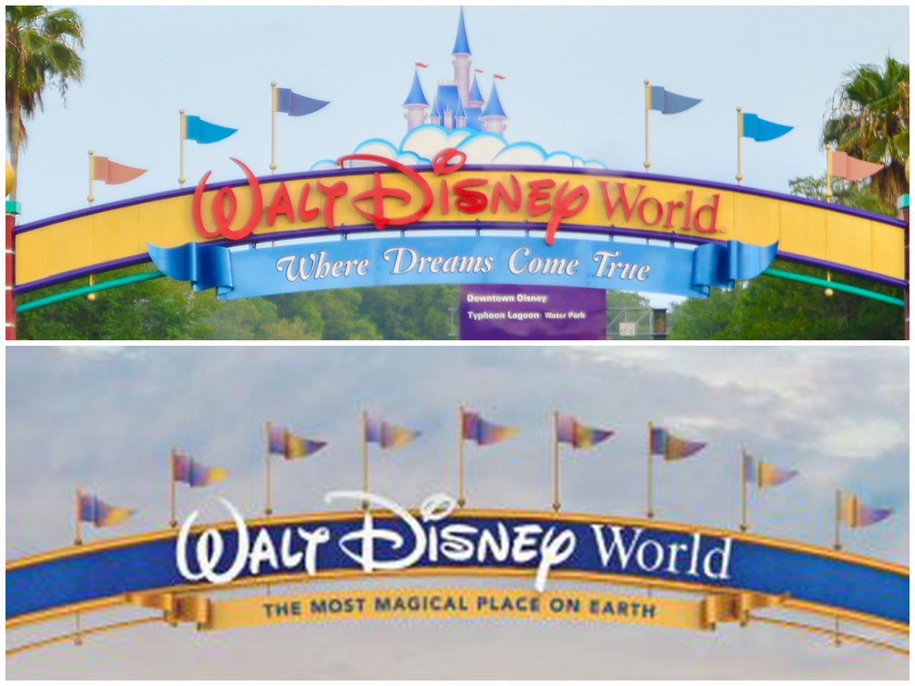 一体何がなくなるのか? ビフォー&アフターを比べて見ると「Walt Disney World(ウォルト・ディズニー・ワールド)」の文字の下に書かれた言葉が、「Where Dreams Come True(夢が叶う場所)」から「The Most Magical Place On Earth(地球上で最も魔法のような場所)」に変わっていた。