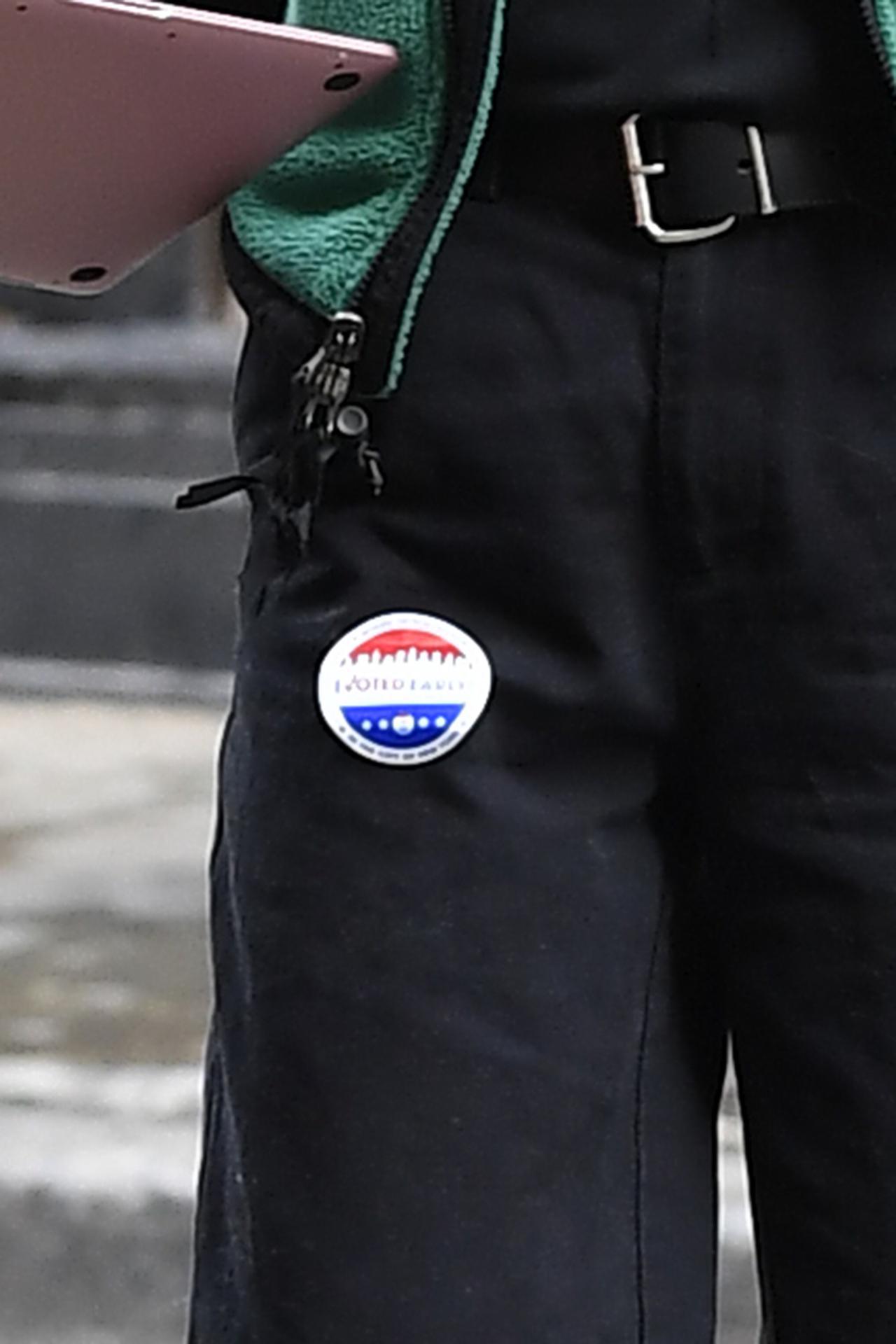 それは、「I VOTED(投票しました)」と書かれたステッカー。ご存じの方も多いと思うが、2020年は4年に一度のアメリカ大統領選挙の年。米現地時間11月3日の投開票が間近に迫るなか、事前投票を済ませたベラは、「I VOTED EARLY(事前に投票しました)」と書かれたステッカーをパンツの目立つ位置に貼って、選挙にちゃんと行ったことをアピール。