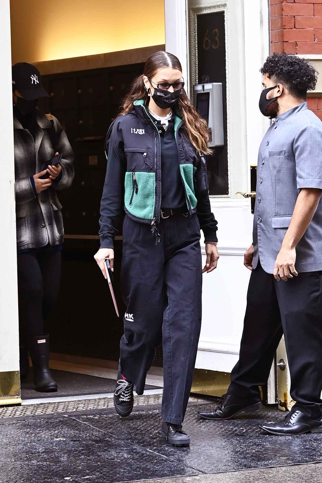 ニューヨーク市内にある自宅アパートから、全身黒ずくめのオールブラックコーデで出てきたベラ。黒のトップスと黒のパンツ、黒のスニーカーに、差し色のグリーンがアクセントになったザ・ノース・フェイスとメゾン マルジェラのコラボジャケットを合わせて、秋のクールカジュアルファッションを完成させた。
