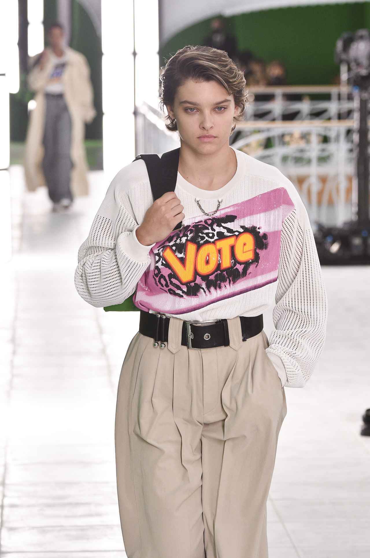 それは2020年10月にパリで行なわれたウィメンズの2021年春夏コレクションで発表された「VOTE(投票しよう)」と胸元にスプレープリントされたニット。しかもそのVOTEとデザインされたニットをルイ・ヴィトンのデザイナーであるニコラ・ジェスキエールは、あえて一番印象に残るショーのオープニングに起用。