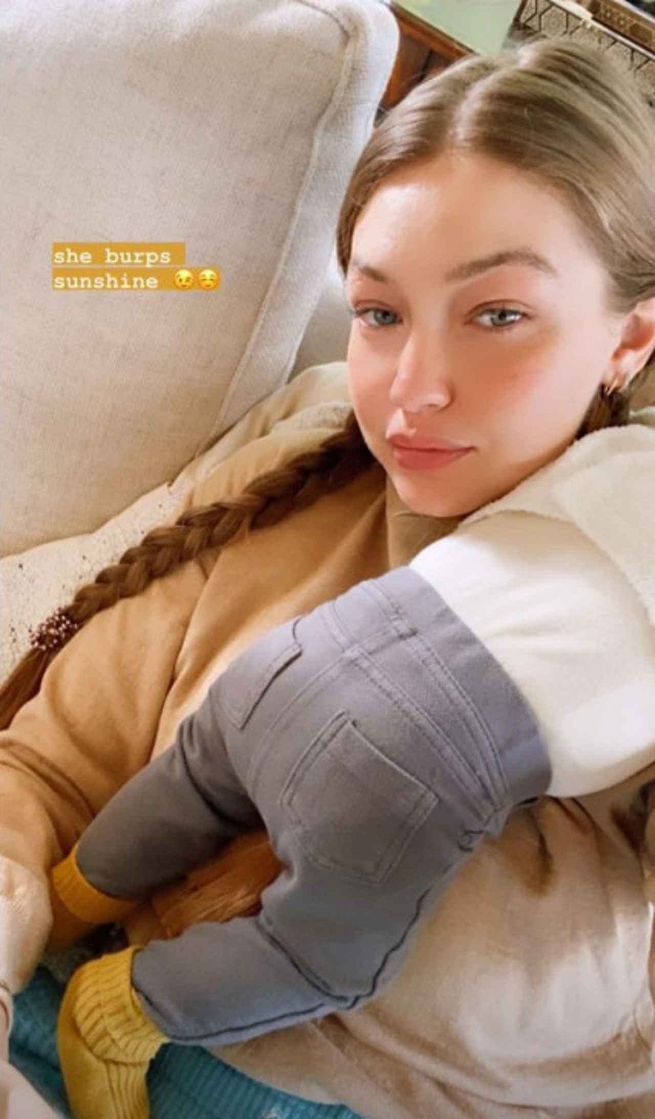 ジジがインスタグラムストーリーで公開したのは、ソファに腰掛けたジジが、ベビーを肩に担ぐようにして抱く写真。