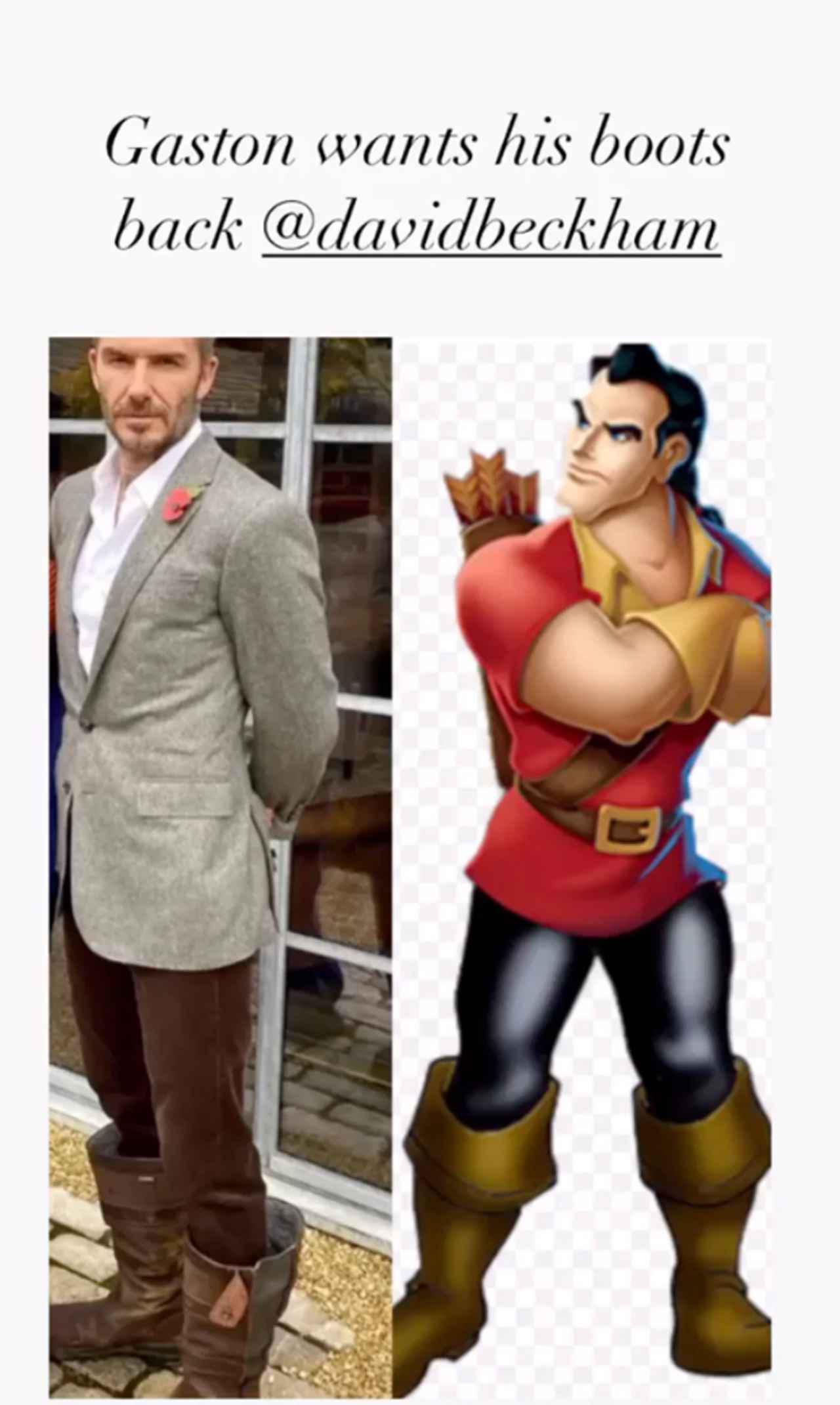 ヴィクトリアにそのブーツをイジられたデヴィッドは、事前に言ってくれればよかったのにと言いたげな様子だったけれど、自分の写真に“ガストン”、ガストンの写真に“自分”とキャプションをつけていたので、デヴィッド自身も笑ってしまったよう。