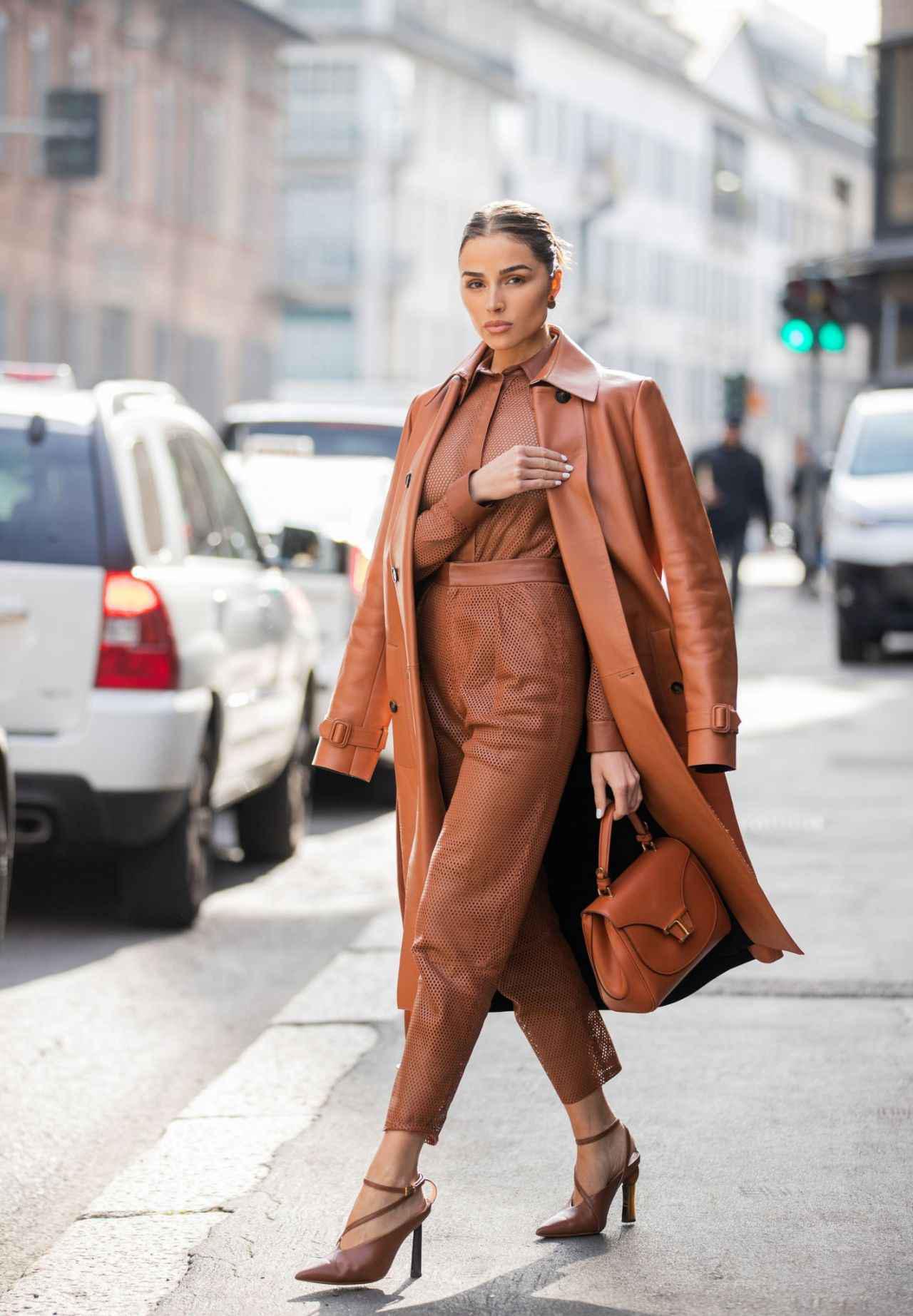 人気モデルのオリヴィア・カルポは、全身キャメルブラウンで統一。シャツとパンツをセットアップで着用し、レザーコートでリッチな雰囲気を作って。