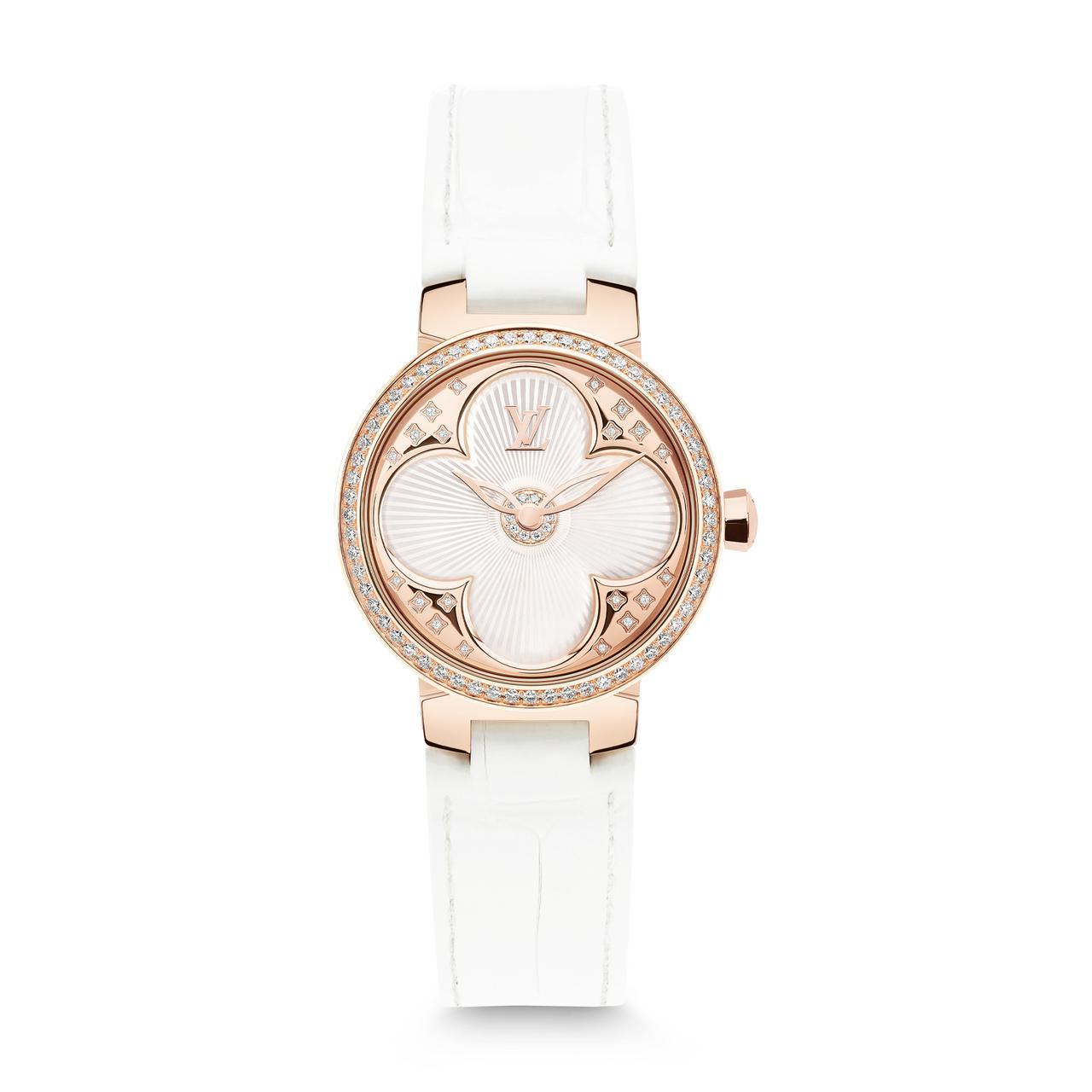 ルイ・ヴィトンの時計製造アトリエ「ラ・ファブリク・デュ・タンルイ・ヴィトン」にて専属の文字盤職人が手掛けたデザインは、ボリュームを持たせながらも繊細かつ美しいシンメトリーに象られたマザー・オブ・パールのモノグラム・フラワーが、ダイヤモンドがセッティングされたピンクゴールドのケースの中心で花開く。