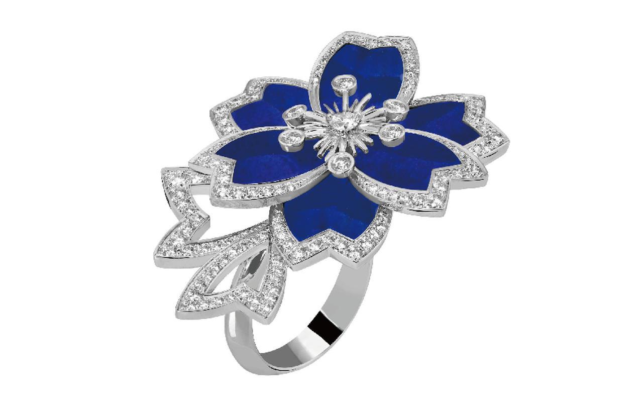 モチーフを縁取るのは、雪の結晶に透かし模様を施したように繊細に輝くダイヤモンド。それぞれの花の中心にあしらった7つの石が、ダイヤモンドの縁取りが生み出すまばゆい光の戯れをさらに際立たせ、肌の上で煌めきを放つダイヤモンドの連なりが極上の軽やかさを演出する。