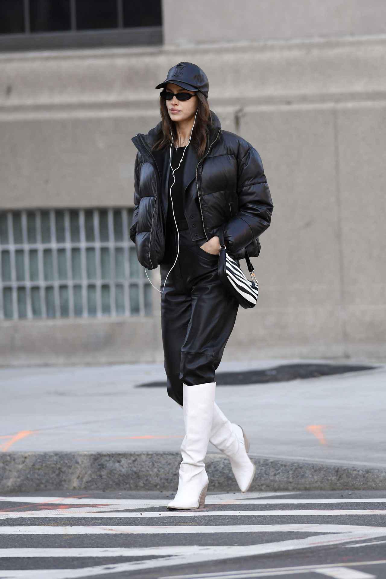 人気モデルのイリーナ・シェイクは、シンプルなブラックのダウンにレザーパンツを合わせたクールな着こなし。足元には昨年から人気のホワイトブーツを合わせて旬なアクセントを投入。