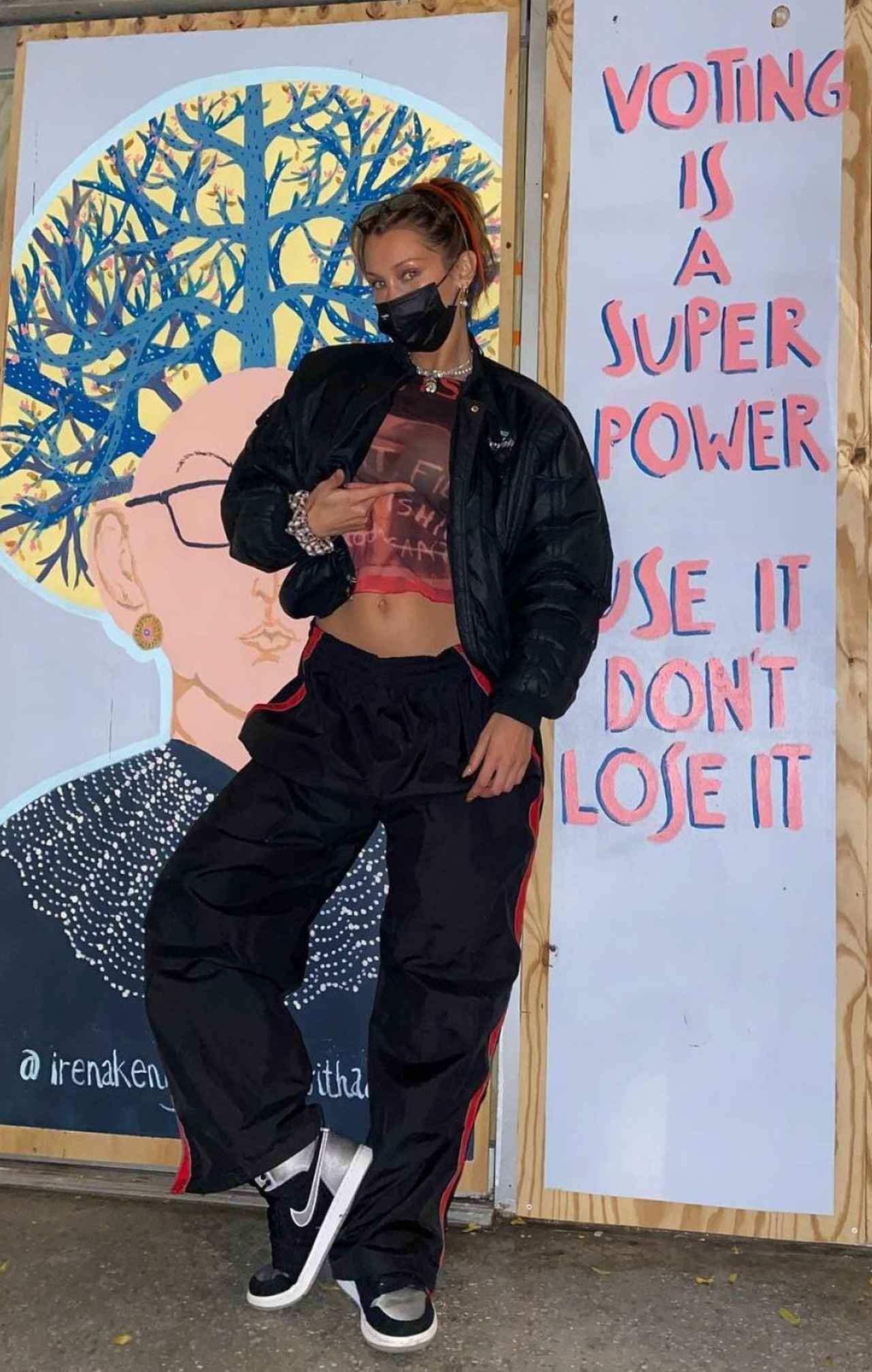 トップモデルのベラ・ハディッドは、フライトジャケット型のダウンを愛用。インナーのTシャツはショート丈にアレンジし、ナイロンパンツはオーバーサイズをチョイスして、ベラがお得意のアーバンストリートルックに仕上げて。