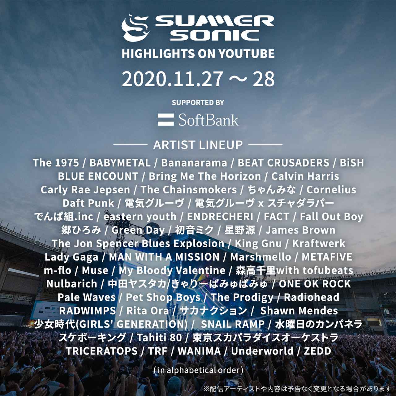 11月 27日(金)と28日(土)の2日間にわたり、「Summer Sonic Highlights on YouTube」と銘打たれた配信イベントが開催されることが発表された。2020年は東京オリンピックが予定されていたため、毎年8月に行なわれる日本最大の都市型フェス、サマーソニックは行なわれず、2020年限定フェスであるスーパーソニックが9月に開催される予定だったものの、新型コロナウイルスの感染拡大によって延期が発表されていた。