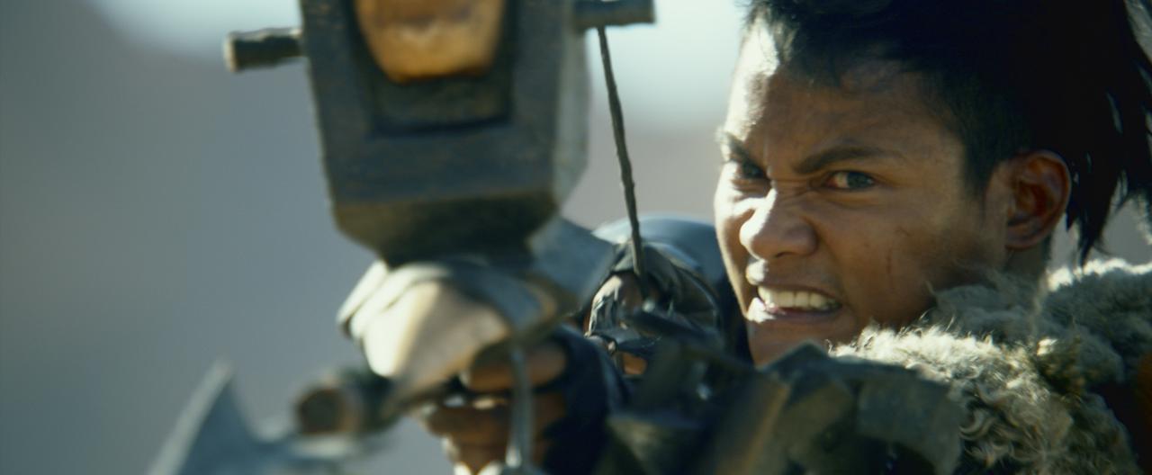 今回解禁された予告映像は、ミラ・ジョヴォヴィッチ演じるアルテミスが率いる特殊部隊が突然、超巨大な砂嵐に遭遇し、巨大モンスター達が跋扈する世界に送り込まれるシーンからスタートする。砂漠に迷い込んだ部隊に襲いかかるのは、モンスター黒角竜(ディアブロス亜種)。そこに現れたのは、モンスターの狩猟を生業とする者トニー・ジャー演じるハンター。近代兵器が通用しないモンスターだけれど、この世界の武器は有効。予告映像では、ハンターがディアブロス亜種を狙う“弓”や、アルテミスが使い方を学ぶ“双剣”など、ゲームでおなじみの武器種が登場。