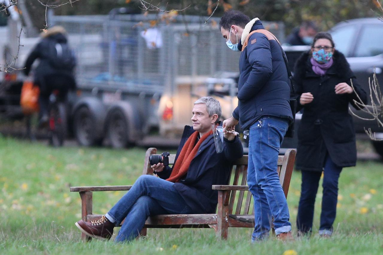マーティン・フリーマンが、イギリスのロンドンにある公園で参加したドラマの撮影で、小道具で遊ぶ姿をキャッチした。(フロントロウ編集部)
