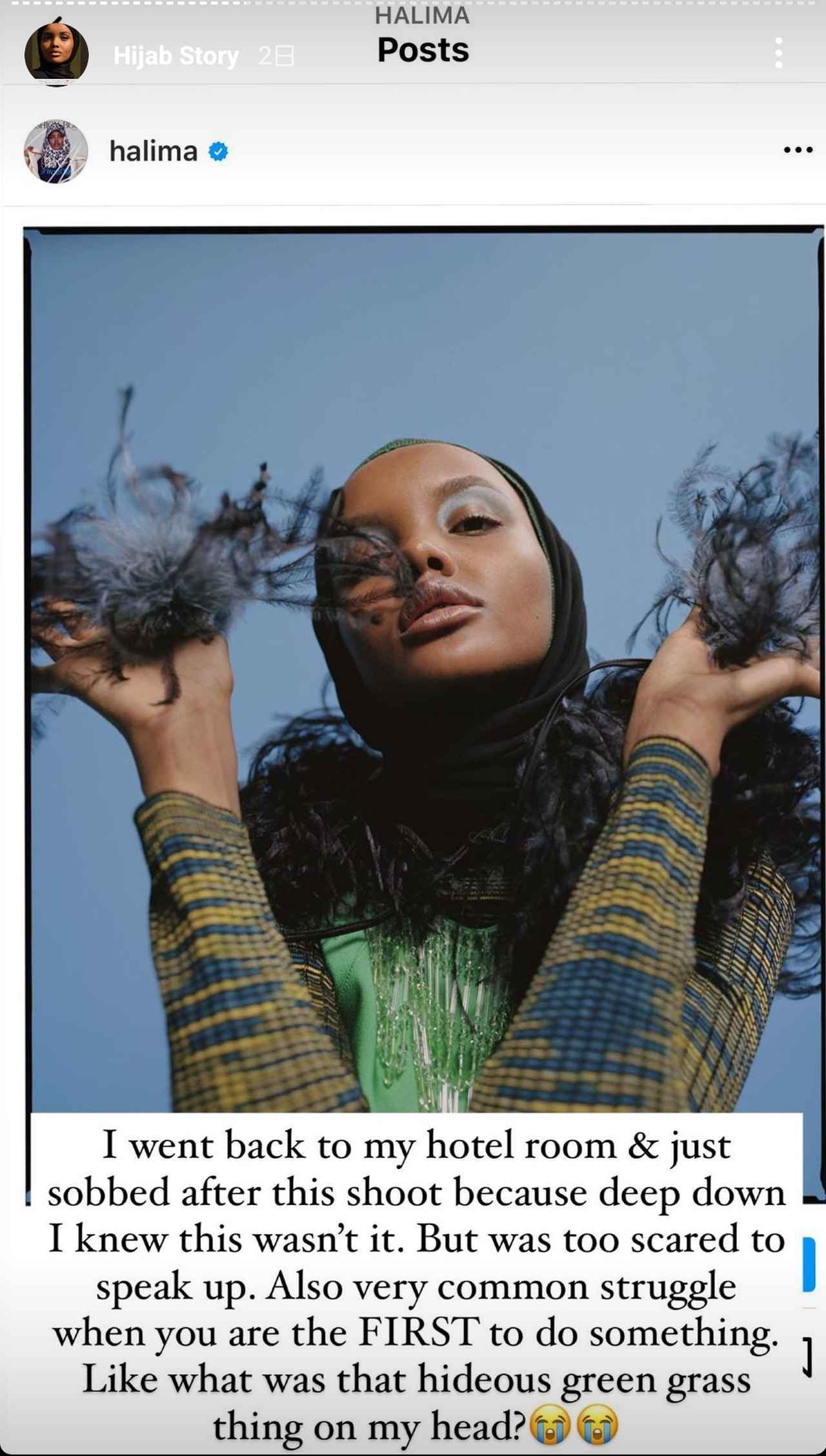 ハリマは自身のインスタグラムのストーリーズで、これまで行なった仕事の写真をアップし、その時の心境を赤裸々に綴った。そこにはヒジャブを被った初めての撮影といった、モデルとして活動していたうえで起こった嬉しかった出来事も公開されていたけれど、妥協して仕事をしている時のことが多く、「正直に言うと、この時とても不快だった。これは私ではない」や「この撮影の後、心の底ではこれじゃないという気持ちがあったから、ホテルに戻ってすすり泣いた。けど怖くて声をあげられなかった。何かの第一人者になるときは、起こりがちな問題だよね」などと、これまで胸の奥にしまっていたものを放出した。
