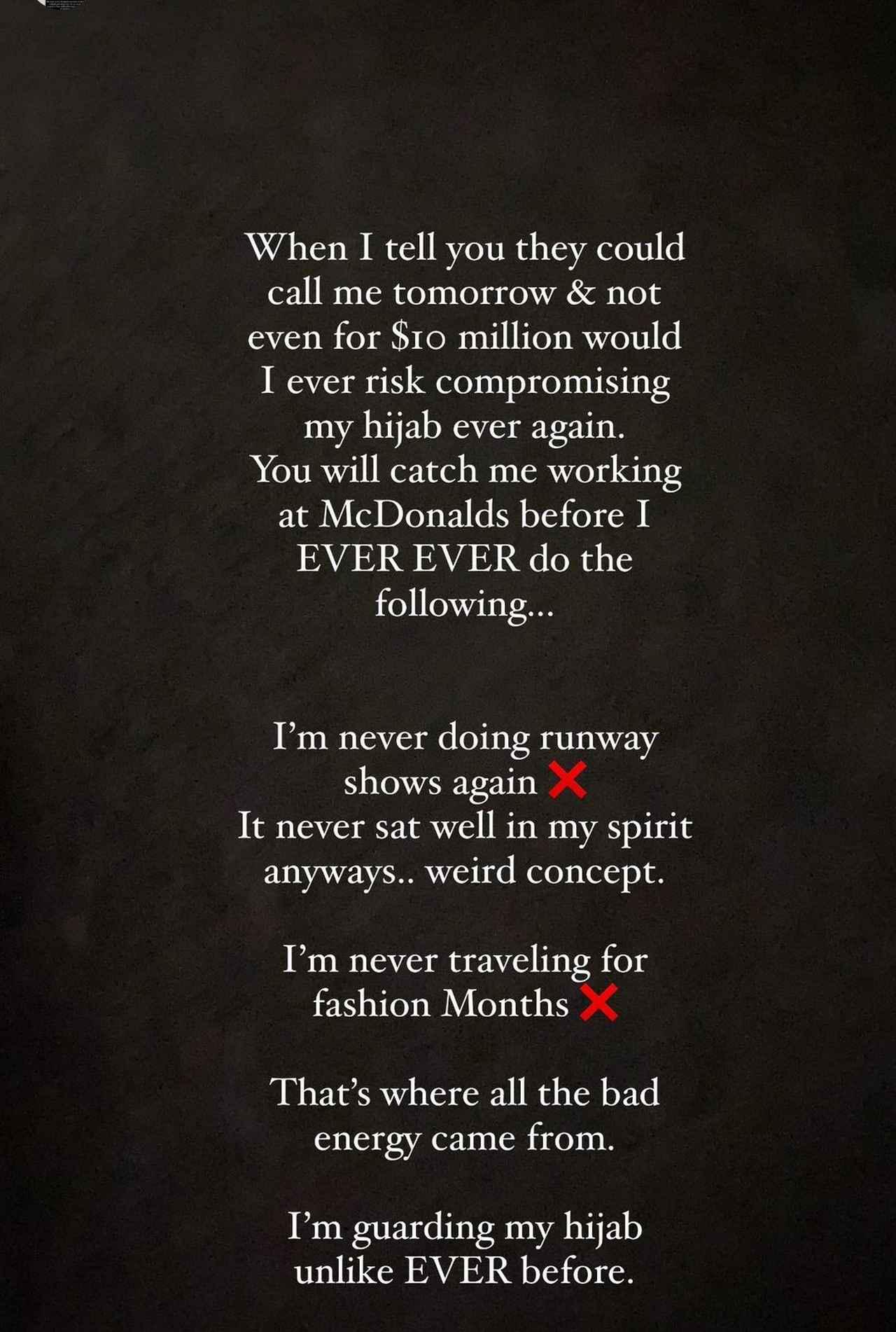 ハリマは「マイノリティの中のマイノリティであることは決して簡単ではない」ということをこれまでにも何度も言っており、嫌な仕事を妥協したりお祈りの時間をくれなかったりと、自分の信念や宗教がファッション業界に認められることが少なかったことをインスタグラムで振り返り、大事なものを守るために引退を決意したよう。