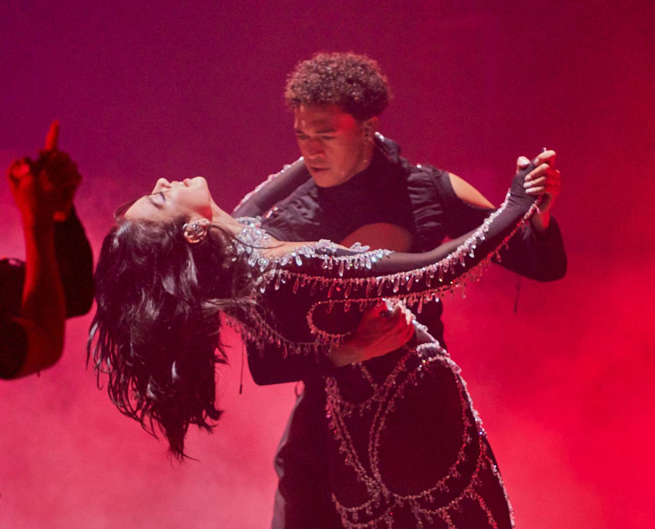 そしてVersaceのブラックパンツにジュエリーブラというスタイルに着替えたデュアは、そのままダンサーに囲まれながら「UN DÍA (One Day)」を披露。この楽曲はJ.バルヴィン、タイニー、バッド・バニーとのコラボ曲なのだけれど、3人は一体どこにいるかというと、テレビの中。まさにリアルとバーチャルの融合。まだまだコラボは続き、ラテン系音楽の次は、ベルギーのシンガーであるアンジェルがリアルに登場。双子コーデを披露した2人は「Fever」を披露し、リアルならではの息のあったパフォーマンスを披露した。