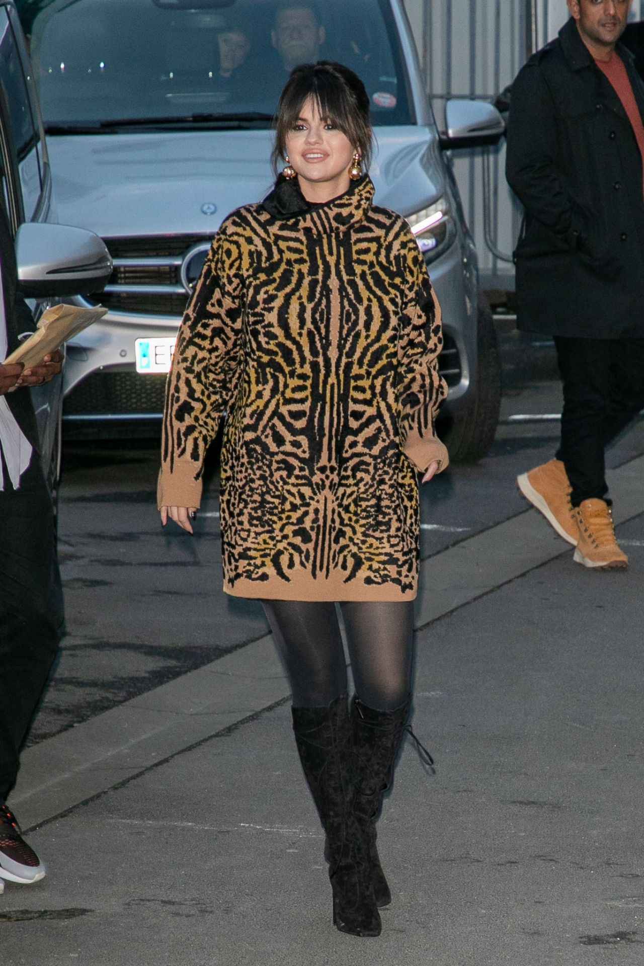 シンガー兼俳優のセレーナ・ゴメスは、アニマルプリントのニットワンピにレースアップのロングブーツを合わせたワイルドな着こなし。大きめのイヤリングを着けて、大胆なニットとバランスを取ったのがセレブらしい。