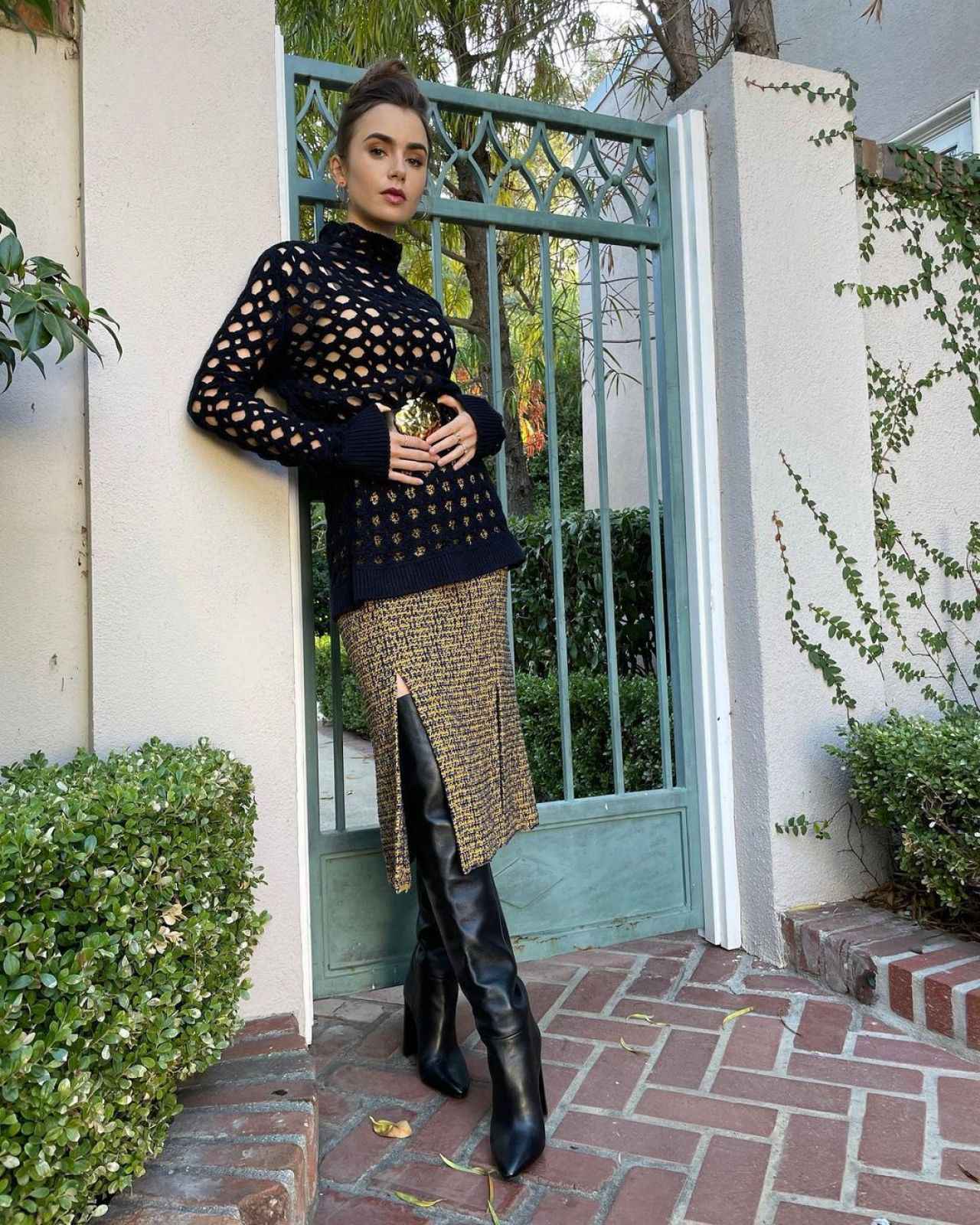リリー・コリンズは、ニットにひざ下丈スカートを合わせ、サイハイブーツを合わせた旬な着こなし。今季はブーツよりも丈の長いスカートを合わせ、タイツのようにこなれて履くのが最旬のブーツコーデ。ブーツはSaint Laurent(サンローラン)のもの。