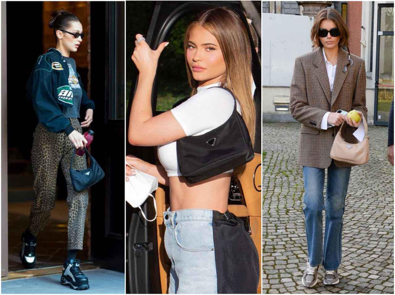 プラダ「ナイロン・ミニバッグ」の火付け役となったトップモデルのケンダル・ジェンナーとベラ・ハディッド、そしてカイリー・ジェンナーはヴィンテージのブラックをヘビロテで愛用中。