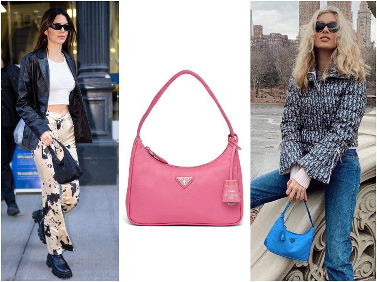ケンダル&ベラが愛用しているのが、2005年に発売された「ヴィンテージ」と呼ばれる昔のバッグだったことにも注目を集め、一時中古市場が動くほど話題に。そのブームを受けてか、2020年にプラダより「リ・エディション 2000 ナイロン・ミニバッグ」として再発売を果たした。新作「リ・エディション ~」は、2005年に発売されたバージョンの懐かしさへのこだわりを残したまま、チャームがセットされモダンに生まれ変わり、多くのセレブたちに愛用されている。