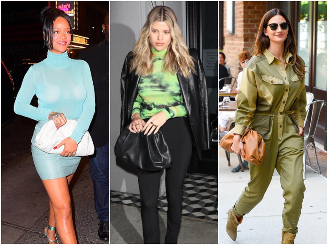 トップシンガーのリアーナは、ライトグリーンのボディコンシャスなワンピに、ホワイトのボッテガ・ヴェネタ「ザ・ポーチ」で旬顔。モデルのソフィア・リッチーリリー・オルドリッジは、クールなパンツスタイルのアクセントに。