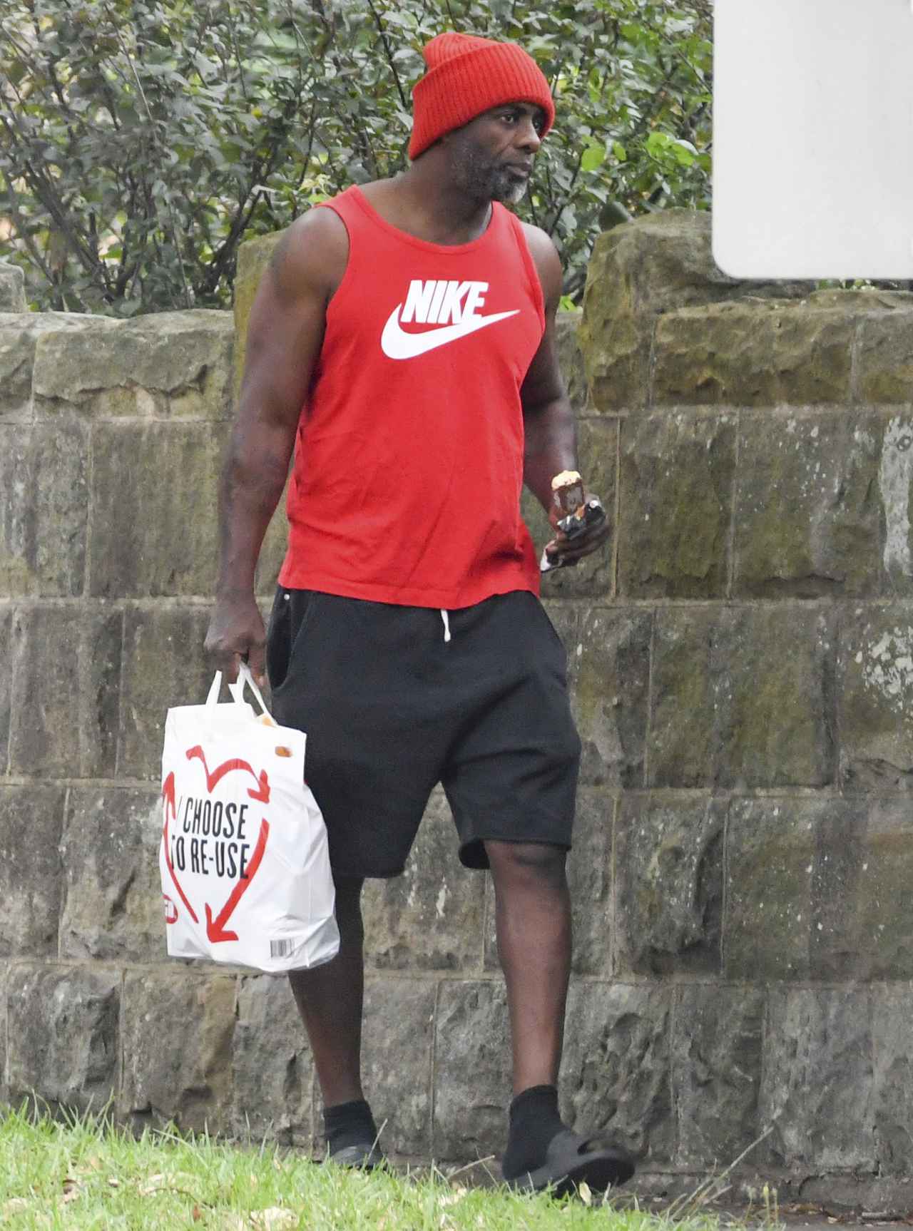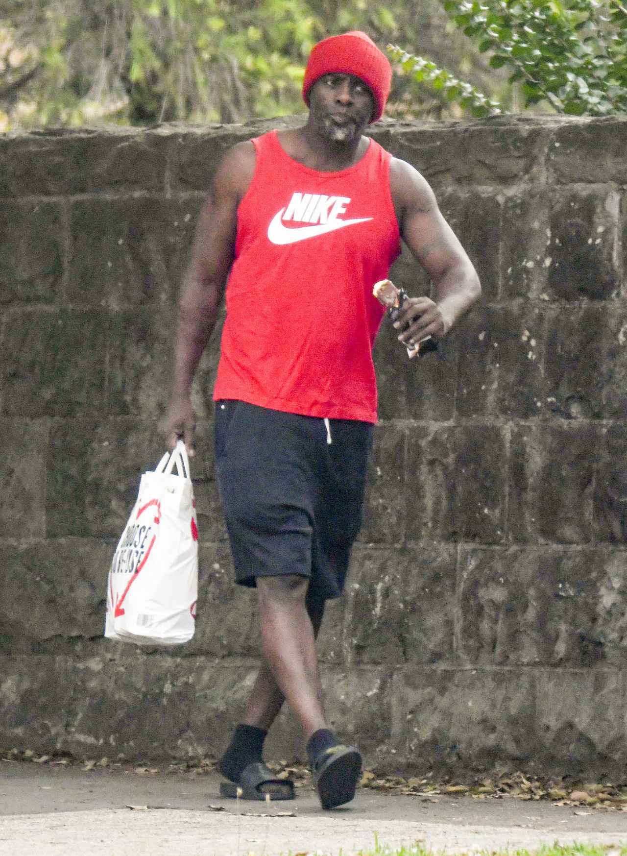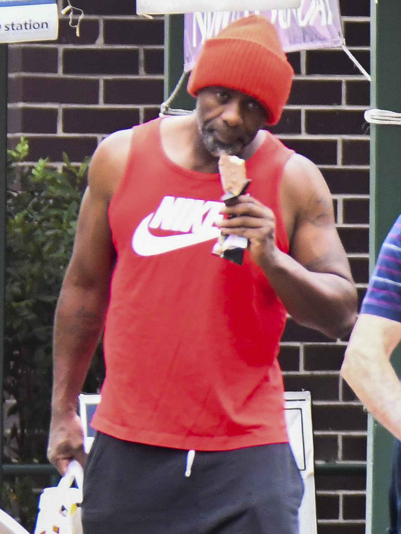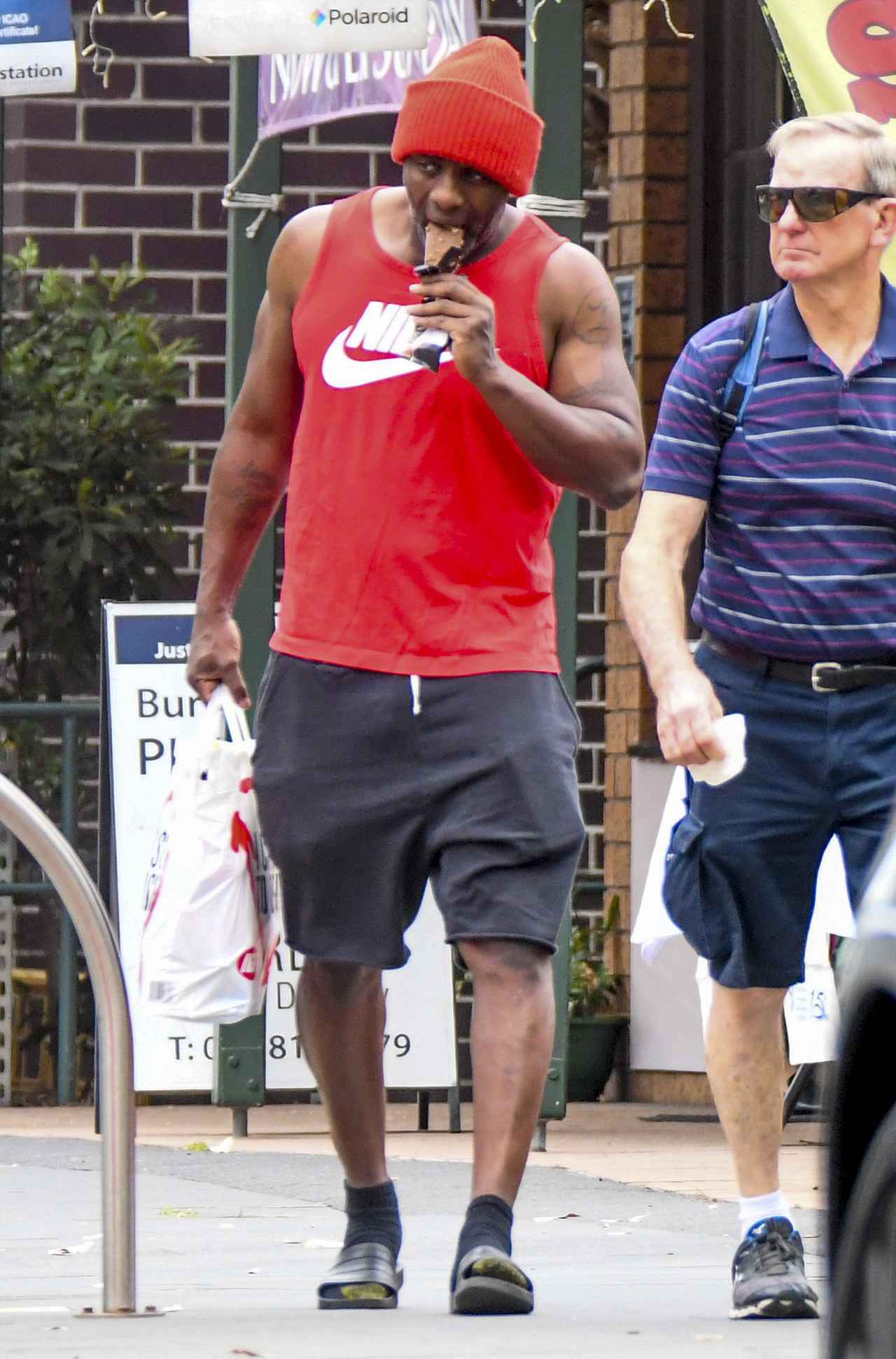 南半球に位置するオーストラリアは現在、夏なので、イドリスはこの日、かなりラフな涼しい服装で散歩に出かけたよう。赤のニット帽に、同じく赤のナイキのタンクトップを合わせ、ハーフパンツに、足元はサンダルという夏らしい格好のイドリスは、アイスクリームを購入していた。
