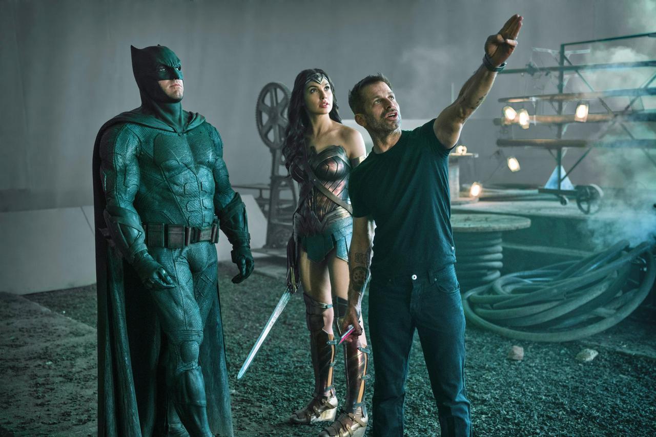 『ジャスティス・リーグ』の撮影中、ザック・スナイダー監督(右)から指示を受けるワンダーウーマン役のガル・ガドット(中央)とバットマン役のベン・アフレック(左)。