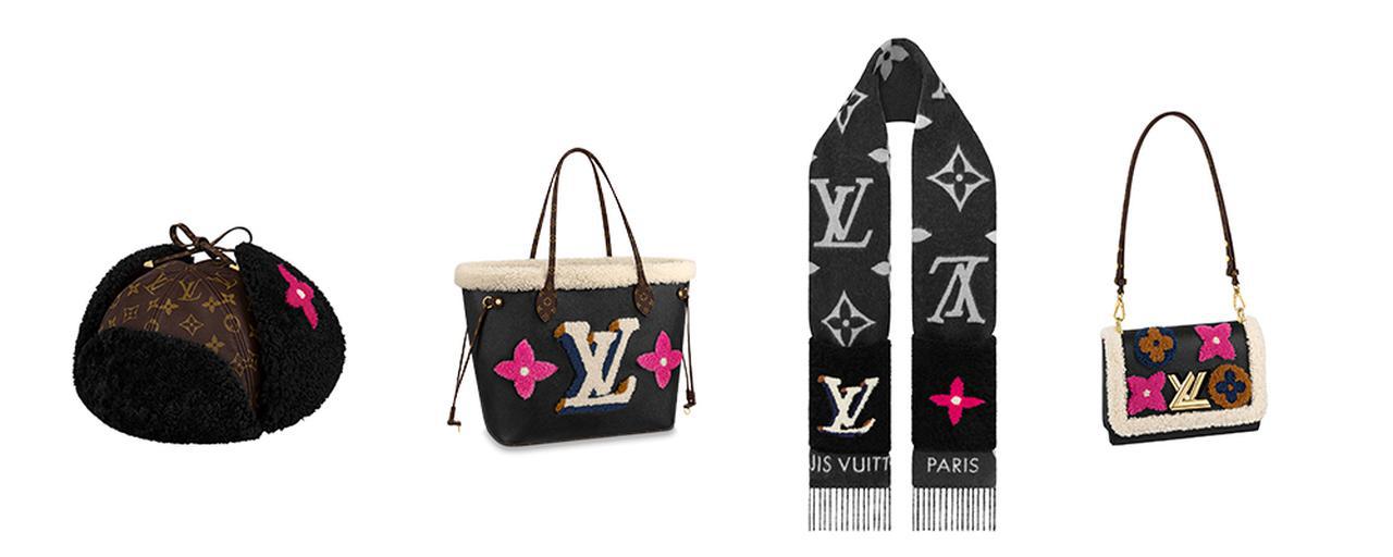 その他にも、柔らかなブラックのグレインレザーにラグジュアリーなシアリングのトリミングを施したバッグや、ポイントでブラックカラーのシアリングをあしらったハットやマフラーなど、この季節に嬉しい防寒グッズもラインナップ。全アイテム共通で、大ぶりなピンクのモノグラム・フラワーのモチーフやLVイニシャルにもシアリングが使用されている。
