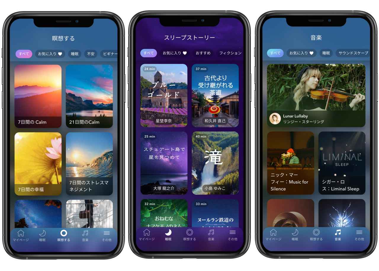 Calmには、日々の瞑想をサポートする「ガイド付き瞑想」から、安眠を促す「読み聞かせ」や「音楽」まで豊富なコンテンツがラインナップ。