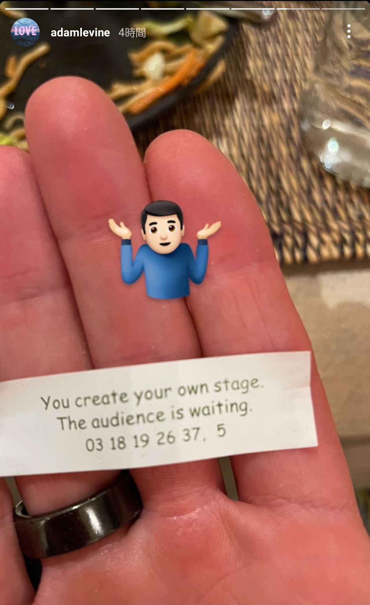 今回アダムが引いたのは、フォーチューンクッキーの中に入っていたと思われるおみくじ。フォーチューンクッキーといえば、中に入っているおみくじを見るのも1つの楽しみ。アダムはそのフォーチューンクッキーのおみくじに書かれていたことを自身のインスタグラムでアップ。そこにはなんと「自分のステージを作りなさい。観客たちが待っている」との助言が。