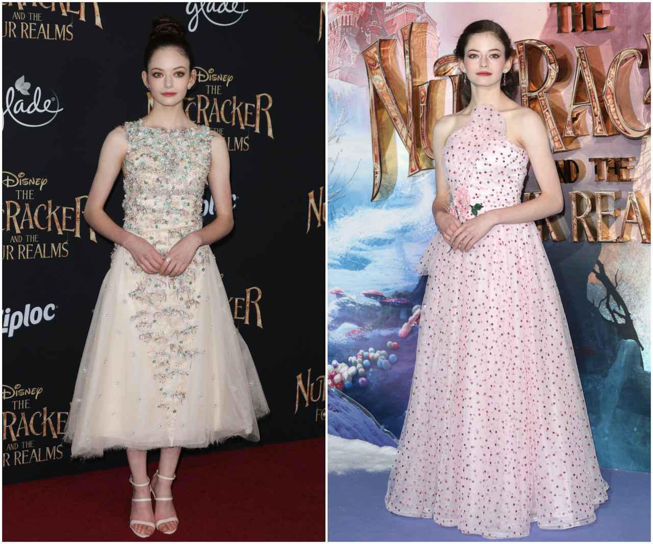 映画『くるみ割り人形と秘密の王国』のUSプレミアではシャネル(左)、ヨーロッパプレミアではロダルテ(右)のドレスを着用した。