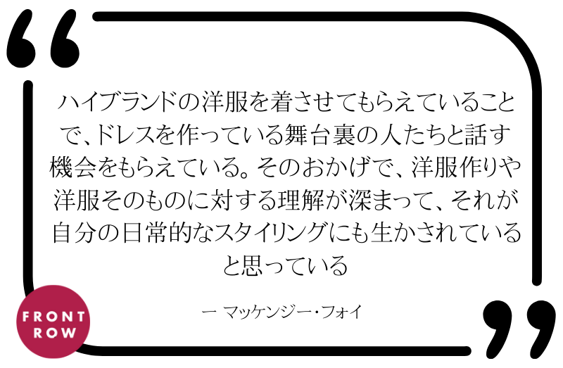 マッケンジー自身もシャネルには思い入れがあるようで、「映画『くるみ割り人形と秘密の王国』のプレミアで着たドレスはとくに思い出に残っている。とても美しかった」とフロントロウ編集部に明かした。