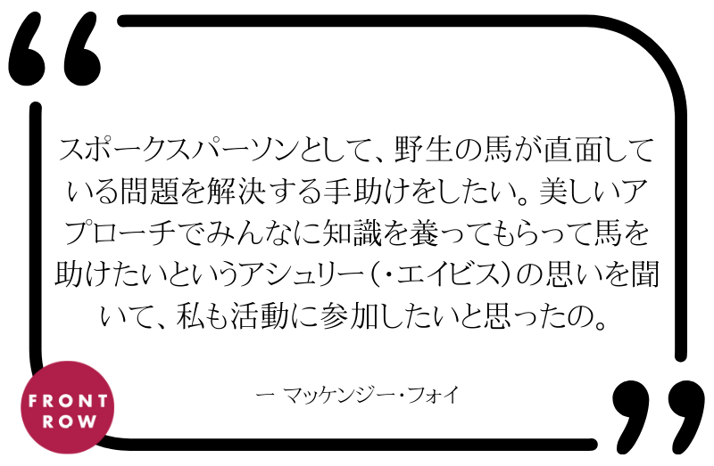 ファイアーフライという名前の愛犬を溺愛するマッケンジー。元々動物が好きだった彼女は、新作映画『ブラック・ビューティー』のリサーチを通して、アメリカの野生馬が生息地を奪われている社会問題を知り、支援団体The Wild Beauty Foundationのスポークスパーソンに就任した。この団体は『ブラック・ビューティー』の制作をきっかけに同作のアシュリー・エイビス監督が立ち上げたもの。